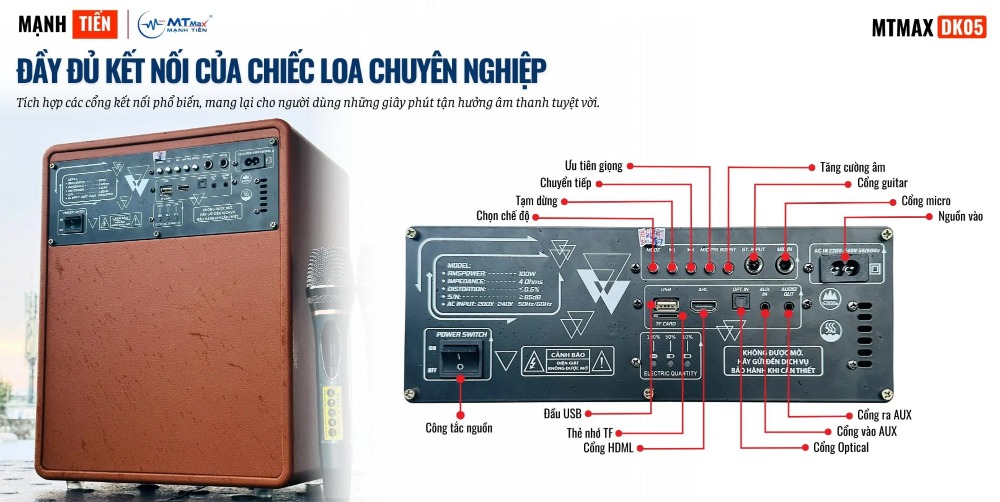 Loa di động MTMAX DK05 được coi là mẫu loa di động đỉnh cao, được ra mắt bởi MẠNH TIẾN. Hội tụ những cải tiến về khả năng nghe nhạc cũng như hát karaoke, MTMAX DK05 có chất lượng âm thanh chuyên nghiệp tích hợp với công nghệ hiện đại bên trong vẻ ngoài nhỏ gọn ấn tượng. Những người đam mê âm thanh chuyên nghiệp chắc chắn không nên bỏ qua siêu phẩm loa di động MTMAX DK05 này.
