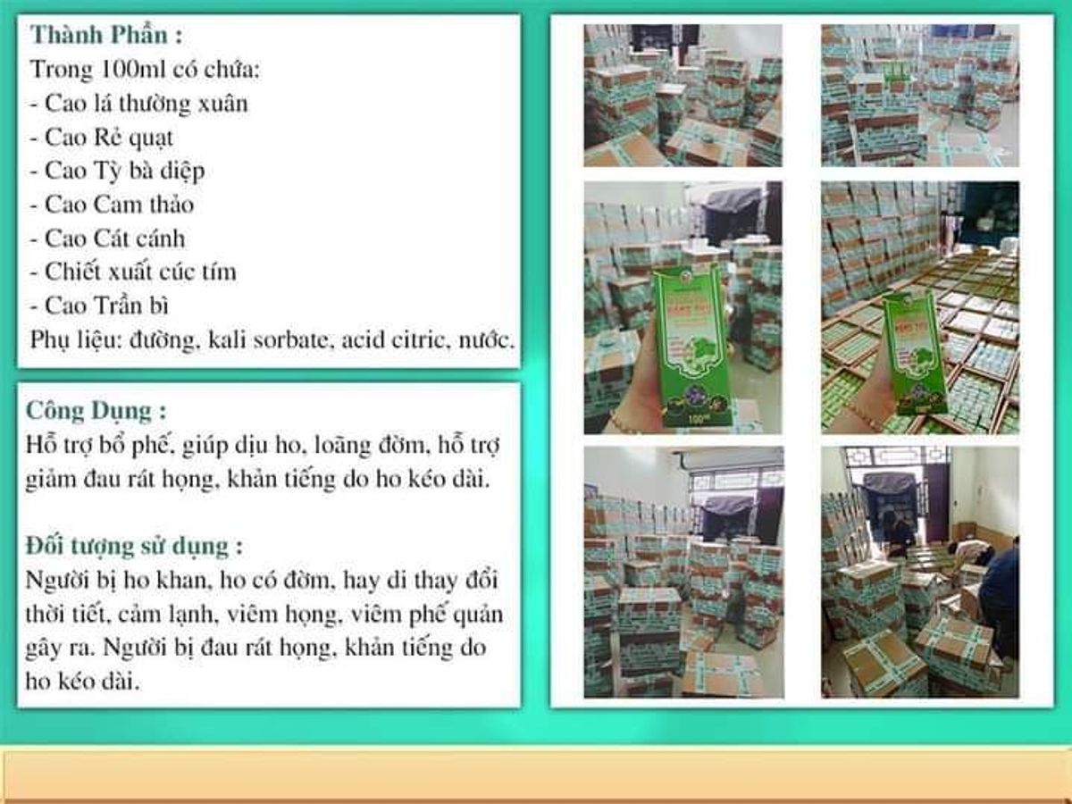 Với các thành phần: cao lá thường xuân, cao rẻ quạt, cao tỳ bà diệp, cao cam thảo, cao trần bì,...
