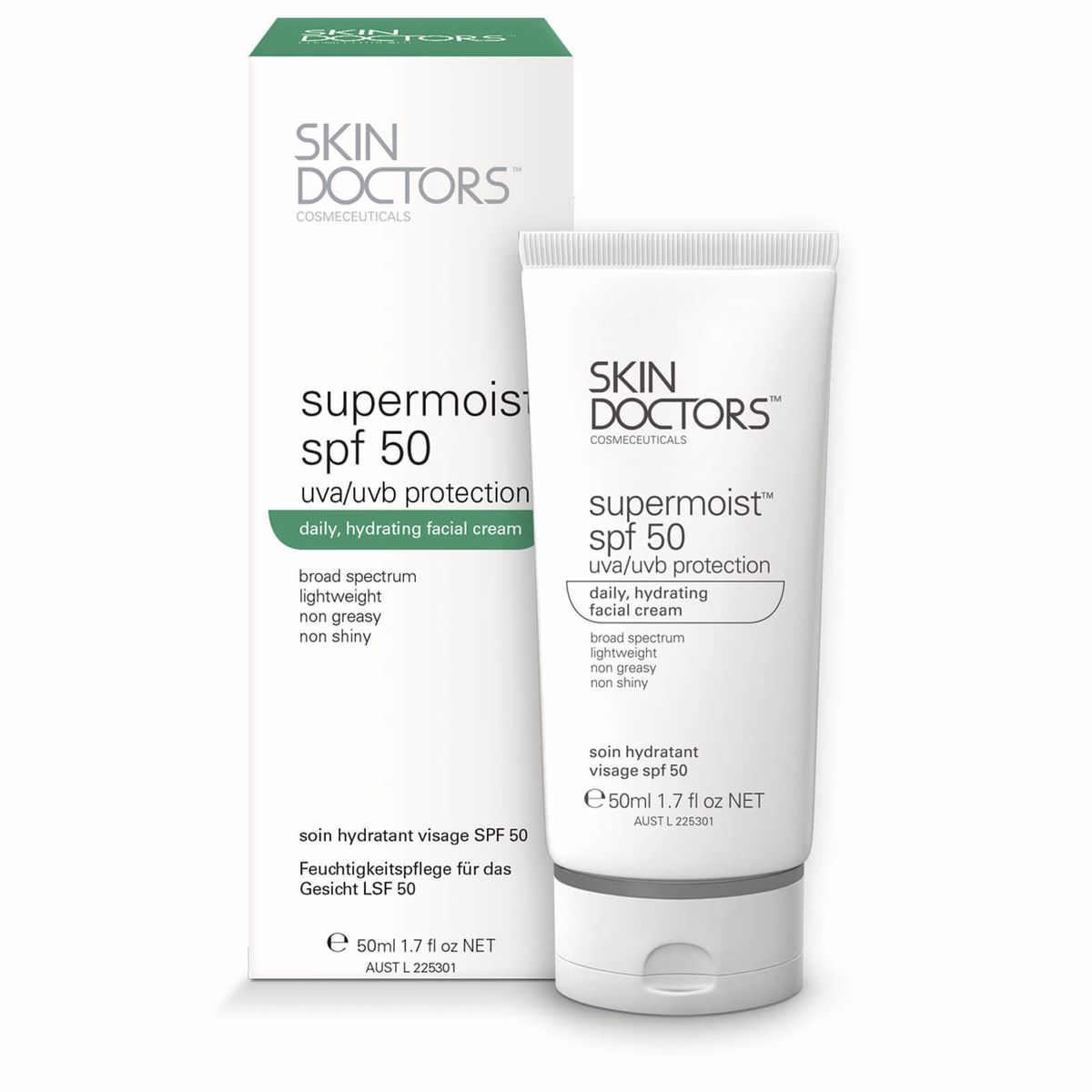 Sản phẩm của dược mỹ phẩm SkinDoctors đem lại những hiệu quả cao cho làn da. SkinDoctors Supermoist SPF 50 có tác dụng chống nắng cao, giúp bảo vệ làn da khỏi nguy hại của ánh nắng mặt trời. Cung cấp chất bảo vệ UVA/UVB SPF 50. Giúp ngăn ngừa lão hoá và đốm nâu.