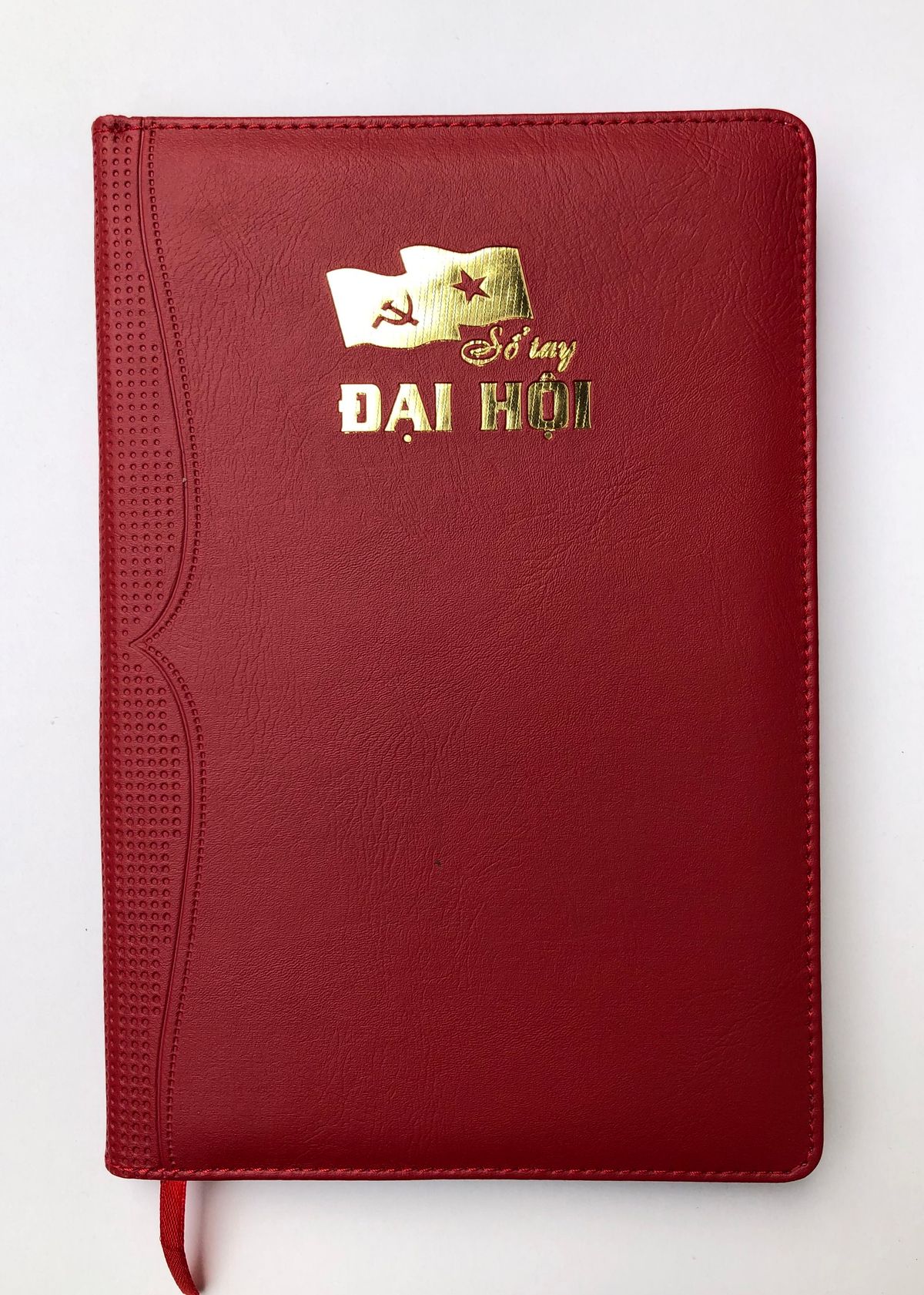 Sổ tay làm bằng chất liệu da Simili, bìa ép nhũ vàng in logo sổ tay đại hội, ruột sổ gồm 200 trang trong đó gồm trang gác in trống đồng, 1 trang ảnh chân dung Bác, 1 trang ghi chú cá nhân, Tiến Quân Ca, QUốc Tế Ca, 22 trang in nội dung Đại hội và 140 trang dòng kẻ