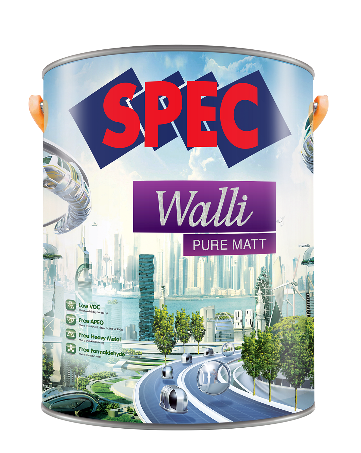 Sơn Spec Walli Pure Matt-Sơn nước nội thất mờ cao cấp được cấu tạo bởi thành phần chính là keo Pure Acrylic đặc biệt, với hàm lượng V.O.C thấp, không mùi giúp cho sơn thân thiện môi trường. Màng sơn láng mịn, có khả năng chống rong rêu tối ưu, độ che phủ cao góp phần giữ cho bề mặt sơn nội thất luôn tươi mới và đều màu. Spec Walli Pure Matt là giải pháp hoàn hảo cho sự sang trọng, hiện đại và bền đẹp cho các công trình xây dựng cao cấp. Đáp ứng các tiêu chuẩn của thị trường sơn trang trí cao cấp tại Châu Á.