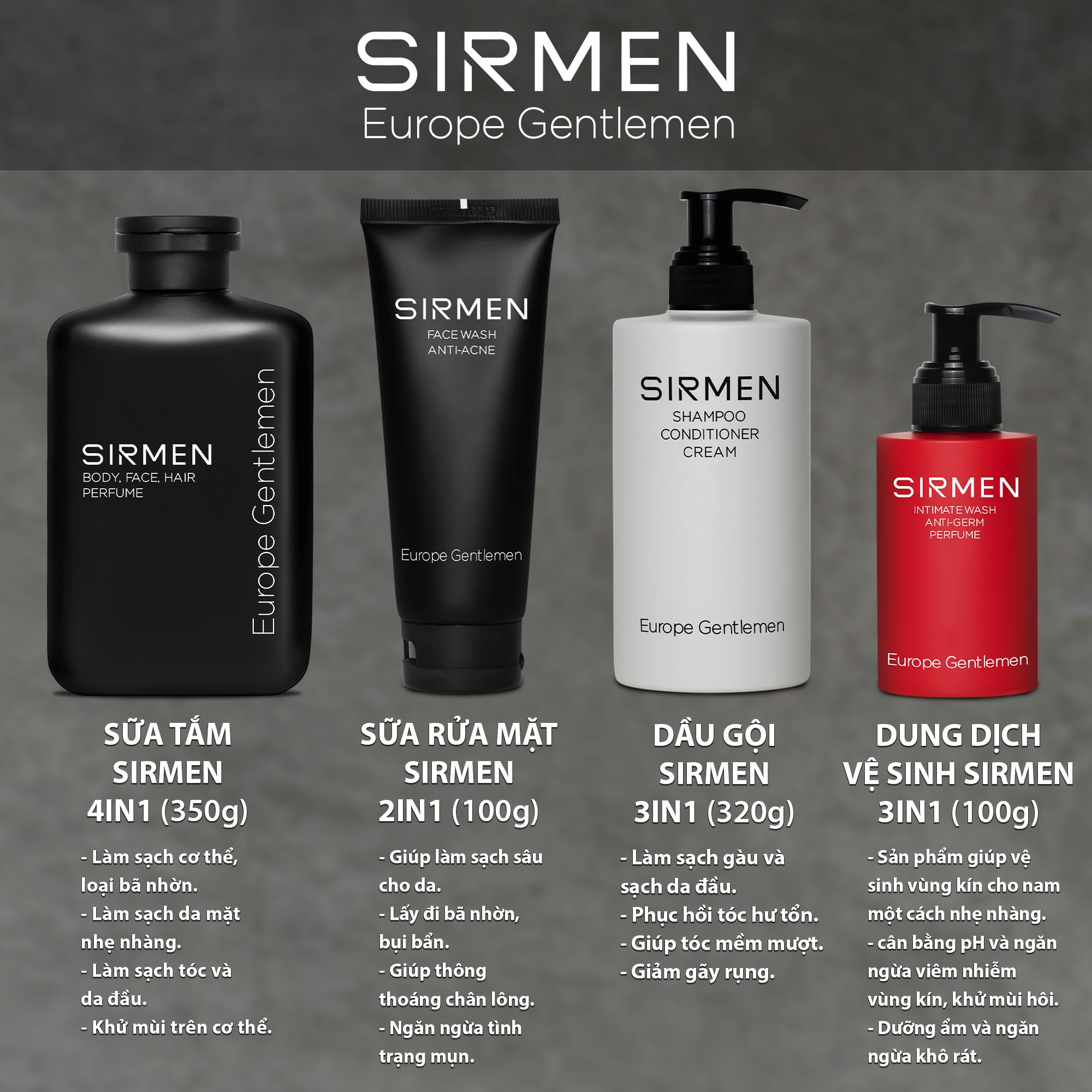 - Sữa tắm gội dành cho nam 4 trong 1 hương nước hoa châu Âu SIRMEN Europe Gentlemen dòng cao cấp 350g chiết xuất tự nhiên bằng công nghệ EU-Nano đậm đặc gấp 2 lần sữa tắm thông thường.