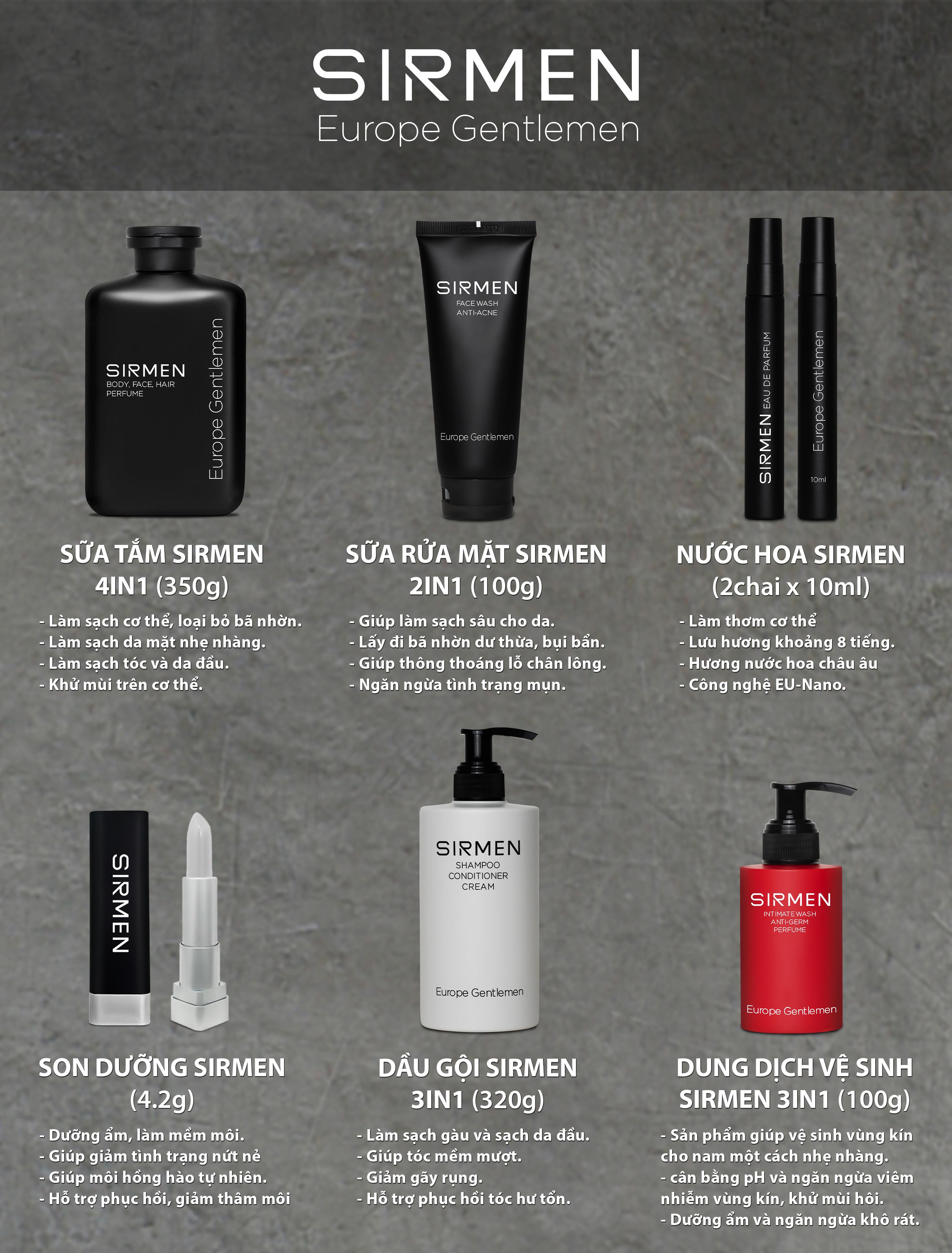 - SIRMEN mỹ phẩm cao cấp công nghệ EU-Nano dành cho khách hàng nam giới trẻ trung sành điệu.