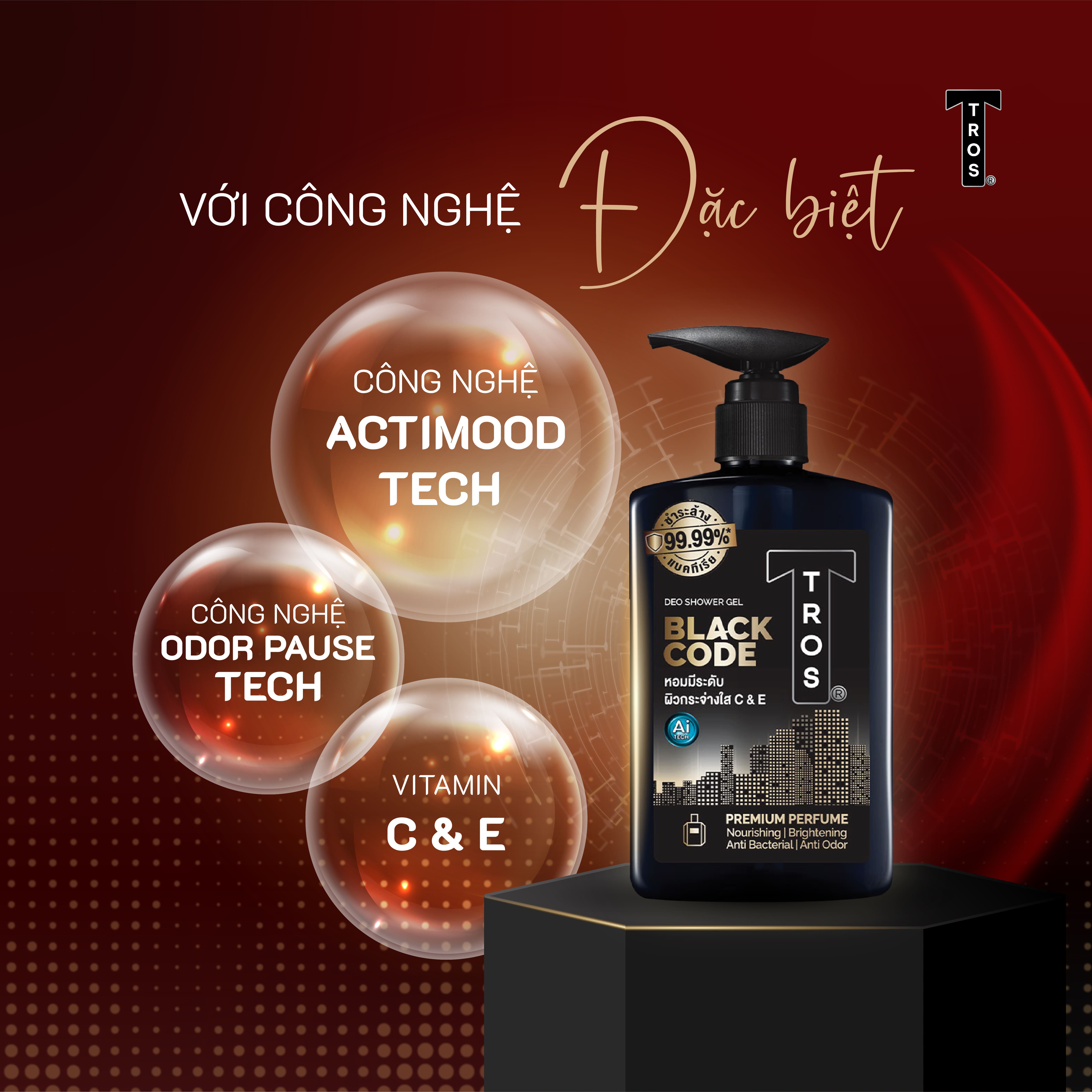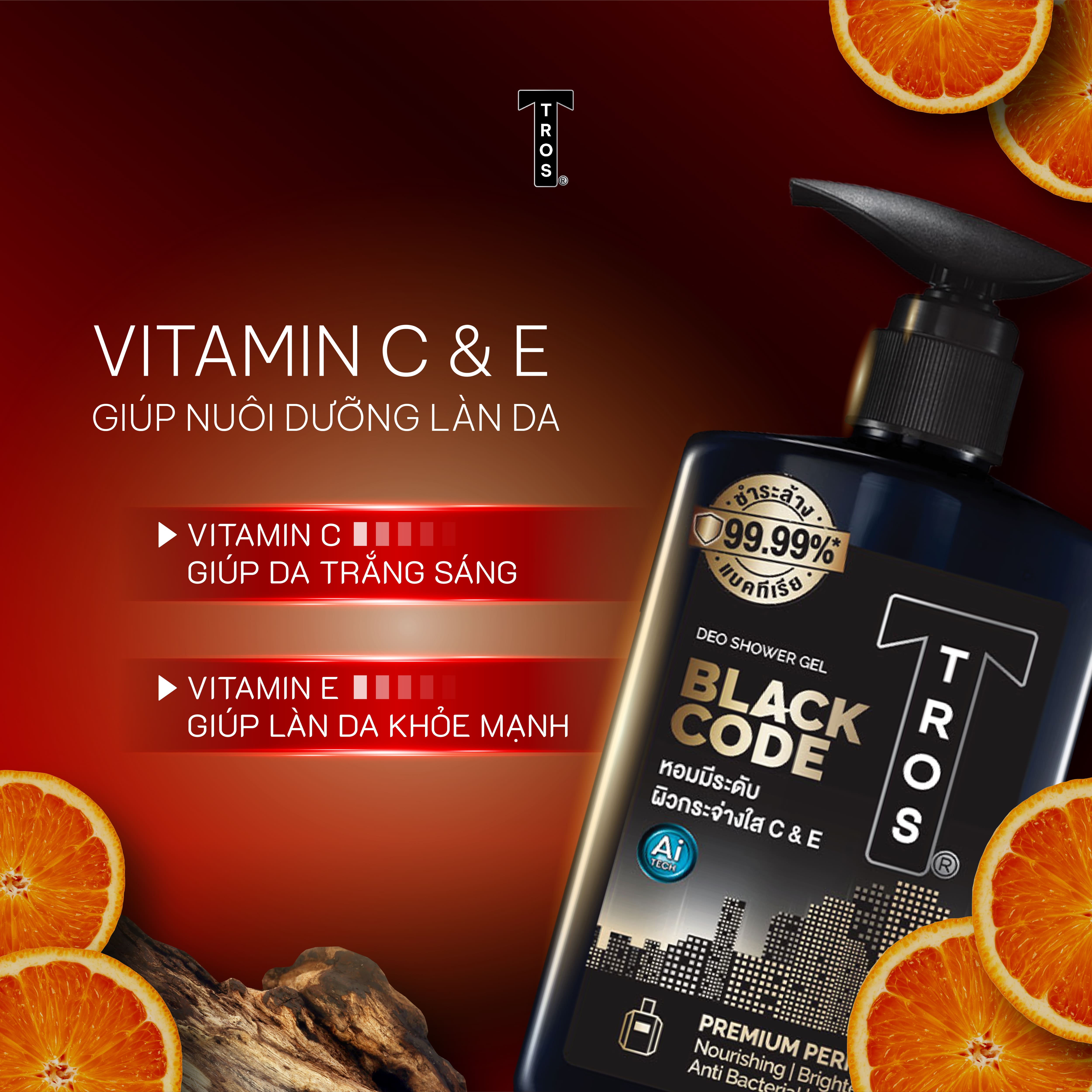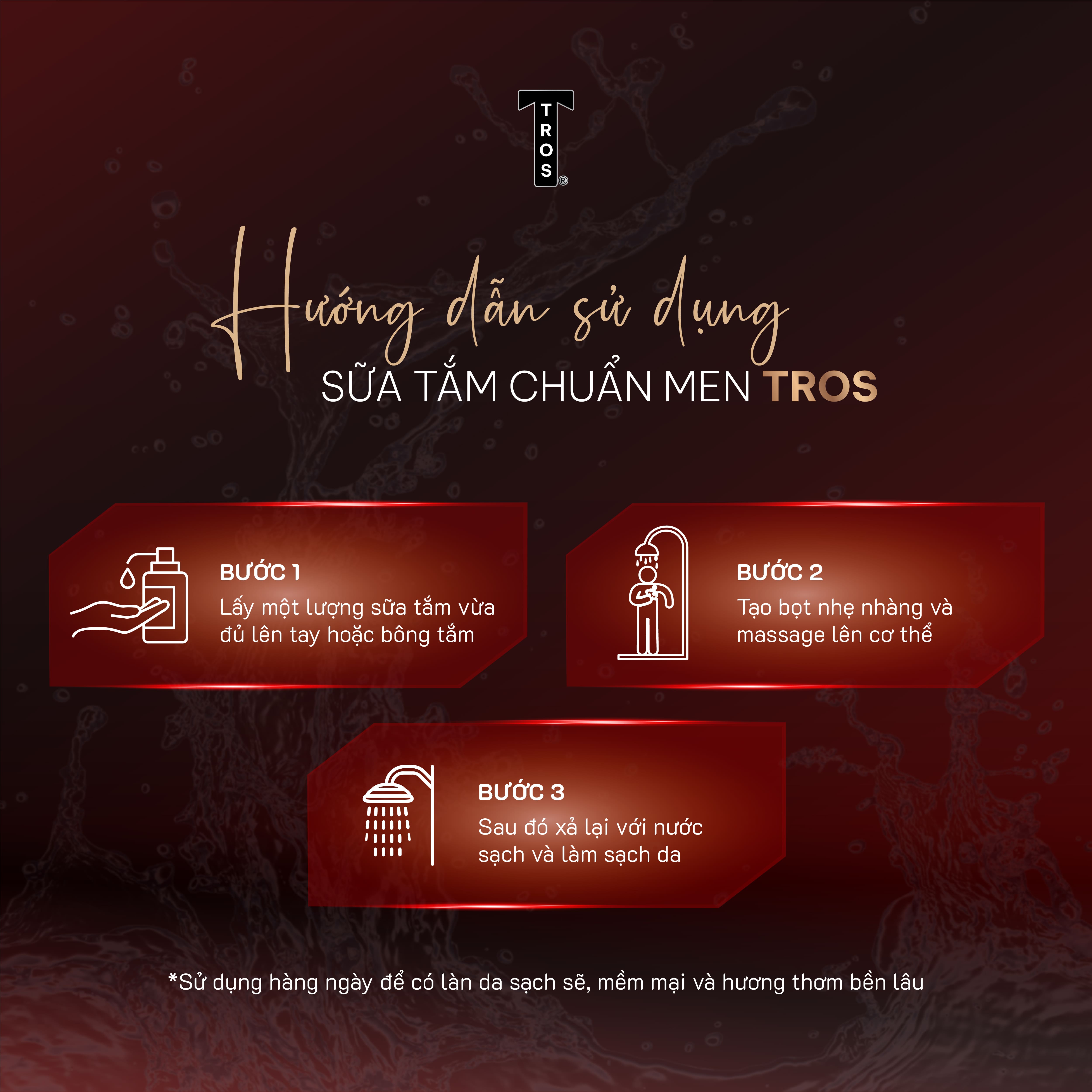 - Làm sạch hiệu quả: Sữa tắm TROS Pro Black Code giúp loại bỏ bụi bẩn, dầu thừa và vi khuẩn gây mùi trên cơ thể.
