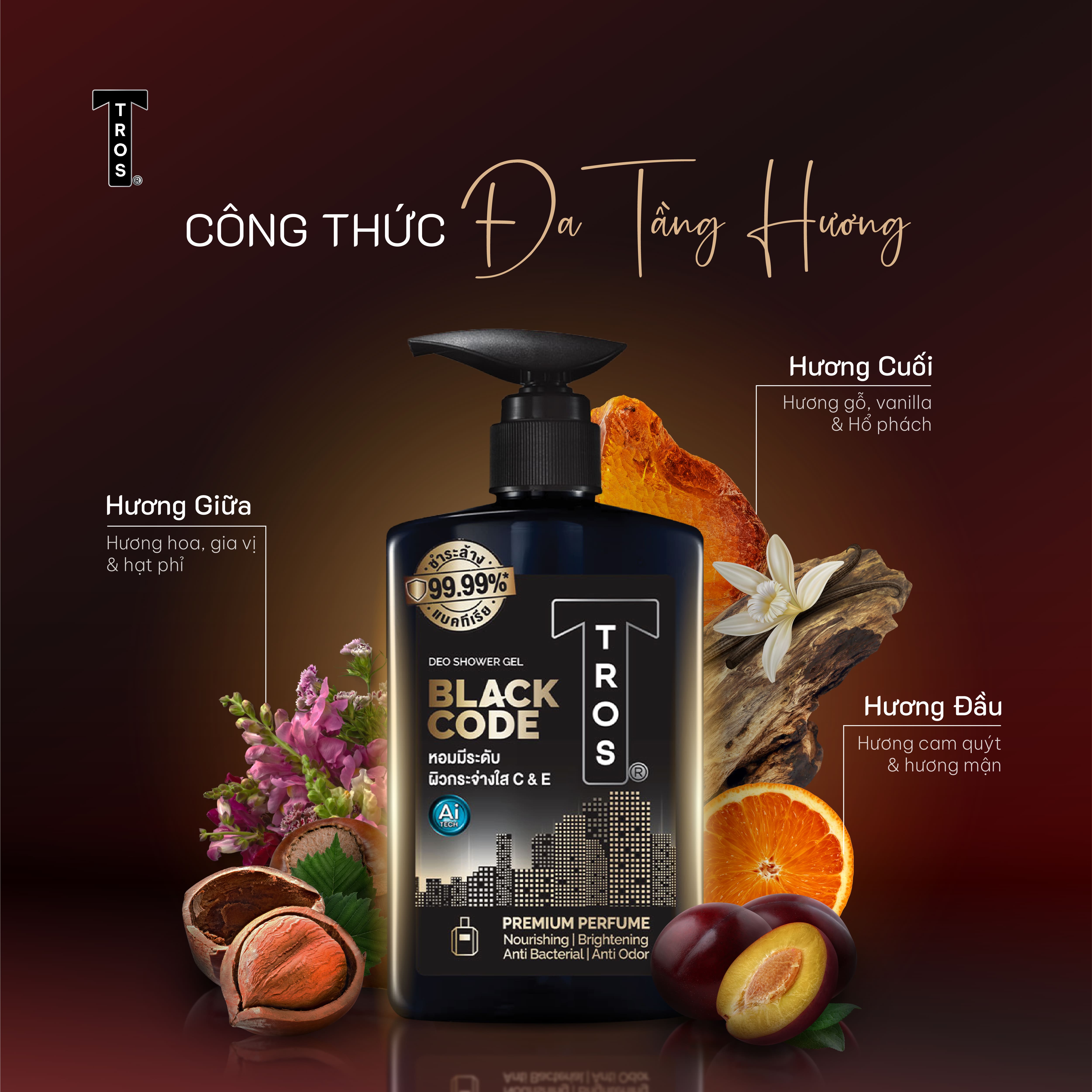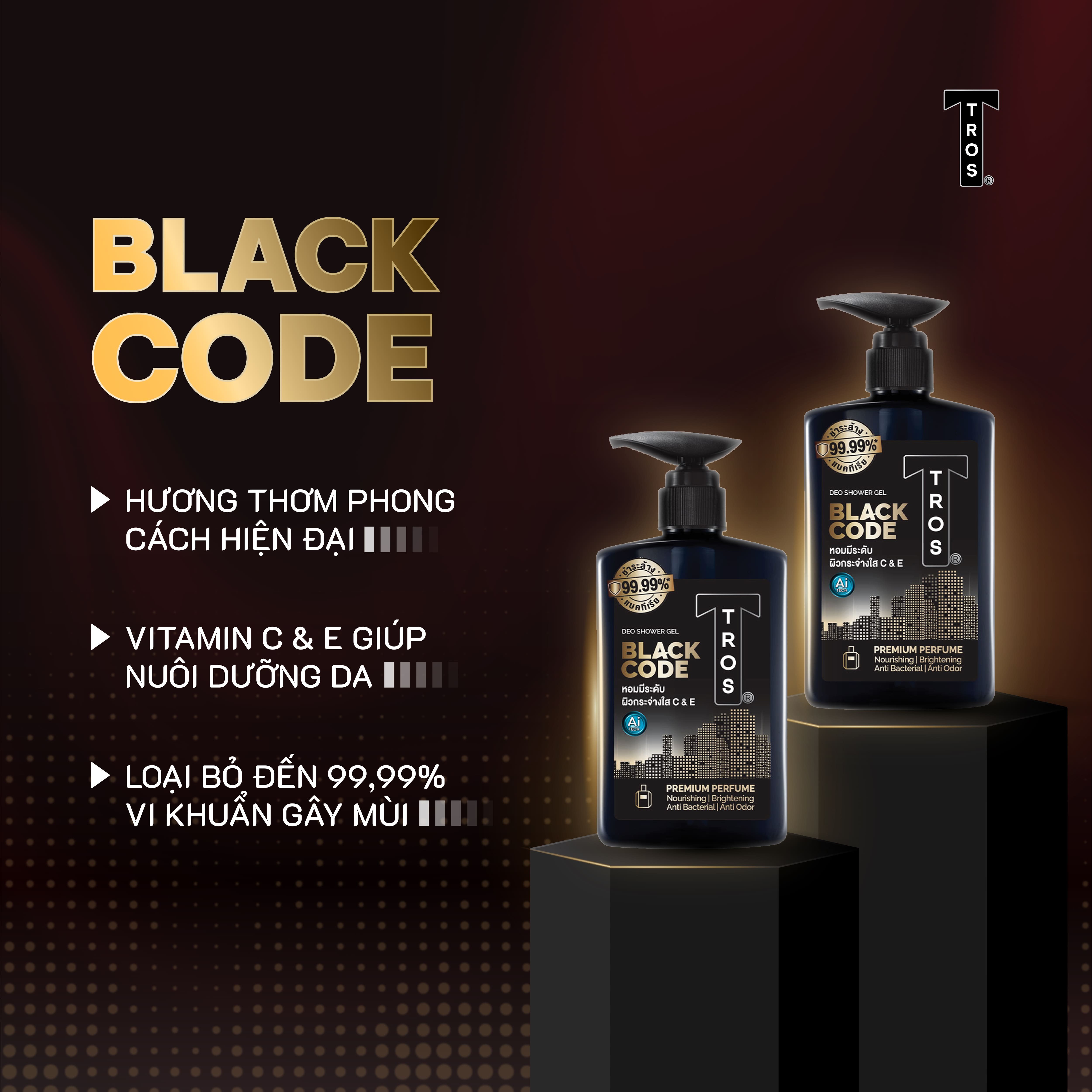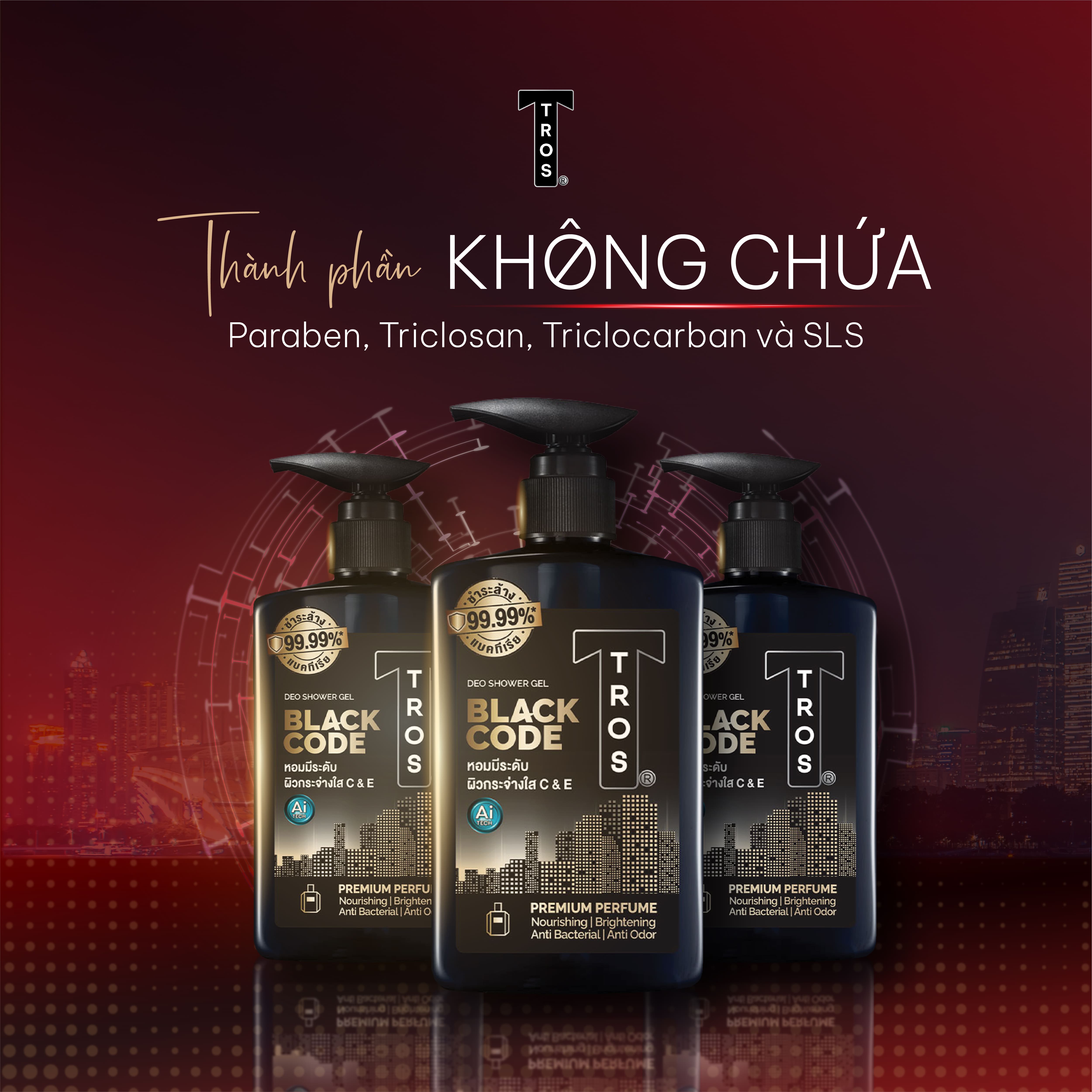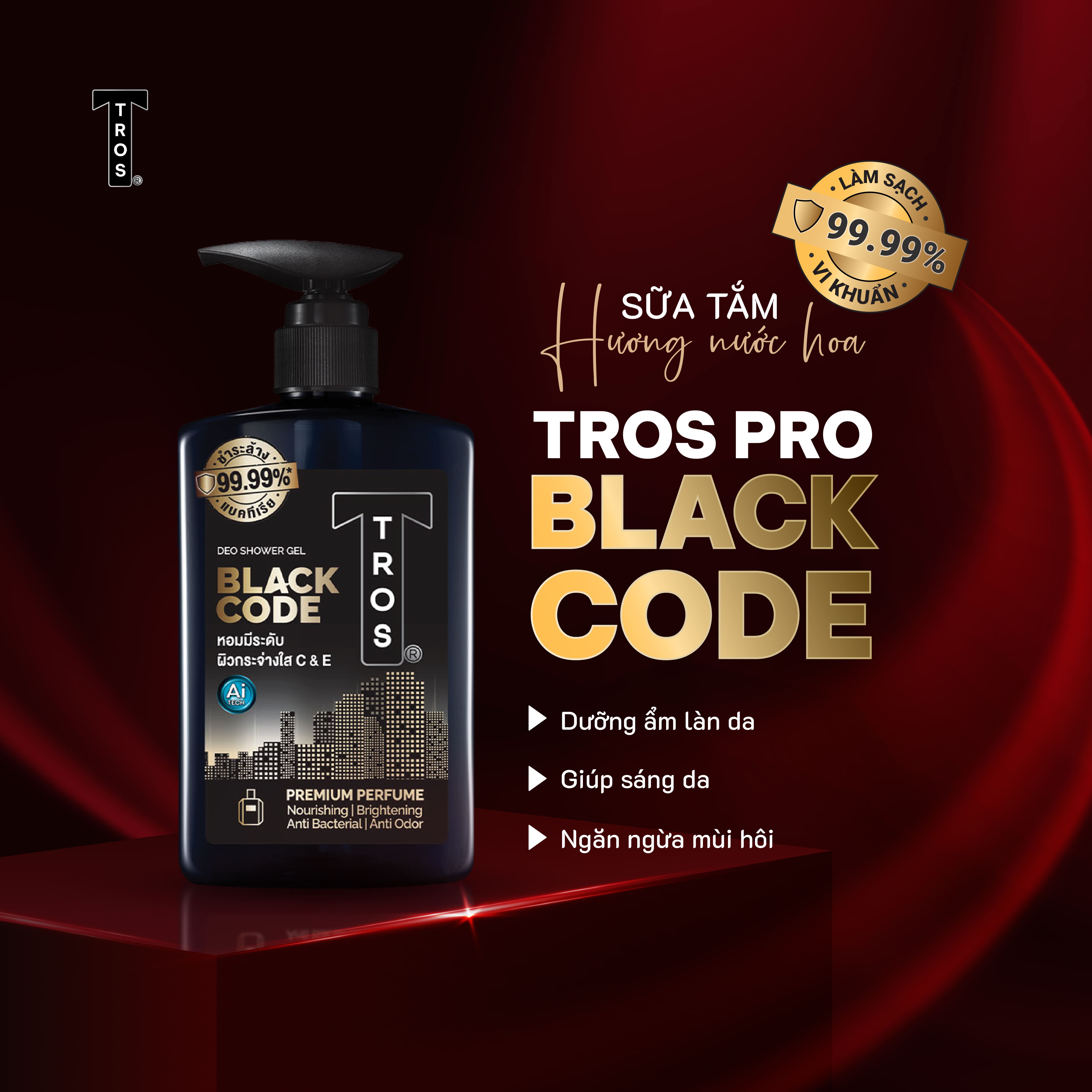 SỮA TẮM NAM TROS PRO BLACK CODE DEO SHOWER GEL DƯỠNG ẨM SÁNG DA NGĂN MÙI DIỆT KHUẨN 450ML - LỰA CHỌN HOÀN HẢO CHO CÁC QUÝ ÔNG LỊCH LÃM