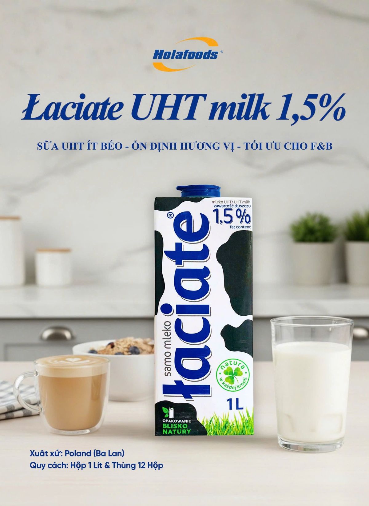Trong vận hành nhà hàng, khách sạn hay quán cà phê, nguyên liệu tốt cần hương vị ổn định, dễ bảo quản và tối ưu chi phí. Łaciate UHT Milk 1,5% (1L) là sữa bò tiệt trùng nhập khẩu từ Ba Lan, ít béo nhưng giàu canxi và protein, cho vị nhẹ cân bằng, dễ ứng dụng - Phù hợp dùng hằng ngày trong bếp và quầy pha chế, từ uống trực tiếp, pha chế đến nấu ăn, làm bánh...