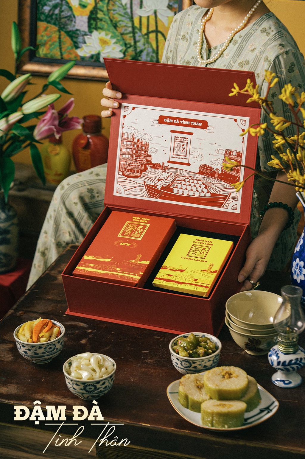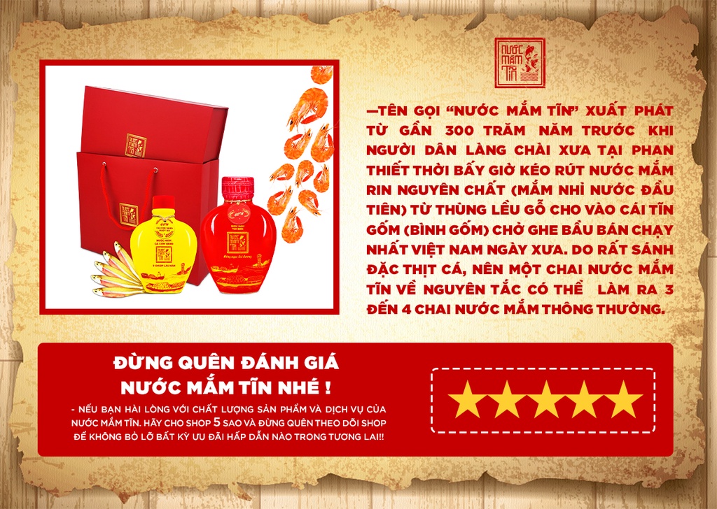 Hộp Quà Đậm Đà Tình Thân bao gồm: 1 Nước Mắm Tĩn Tôm Biển 60N 500ml Và 1 Tĩn Cá Cơm Ruột Đỏ 250 ml không chất bảo quản