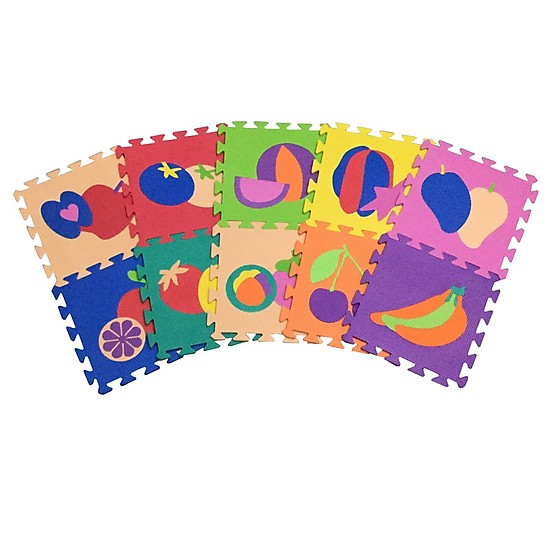 Bộ 10 tấm thảm xốp lót sàn cho bé hình trái cây với màu sắc nổi bật, giúp cho bé vừa chơi vừa học. Mẹ có thể trải ra sàn hoặc ghép thành khối hộp vuông để bé chơi. Độ dày lên tới 1cm nên trẻ có thể thoải mái vận động, tập bò, tập đi nếu có ngã, hay bị cộc đầu xuống sàn cũng không sợ đau vì thảm rất dày và êm ái. Thảm còn có tính cách nhiệt cao nên bạn cũng không phải lo bé nằm, ngồi chơi dưới sàn nhà lâu có thể bị lạnh chân, lạnh lưng…