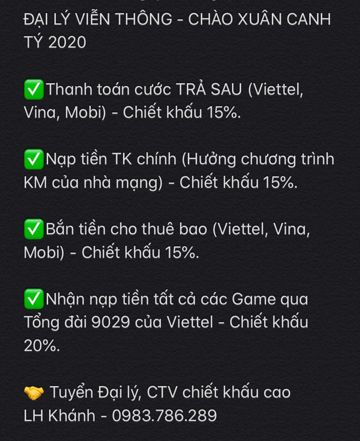 Bắn tiền cho thuê bao Viettel, Vina, Mobi - Chiết khấu 15%.