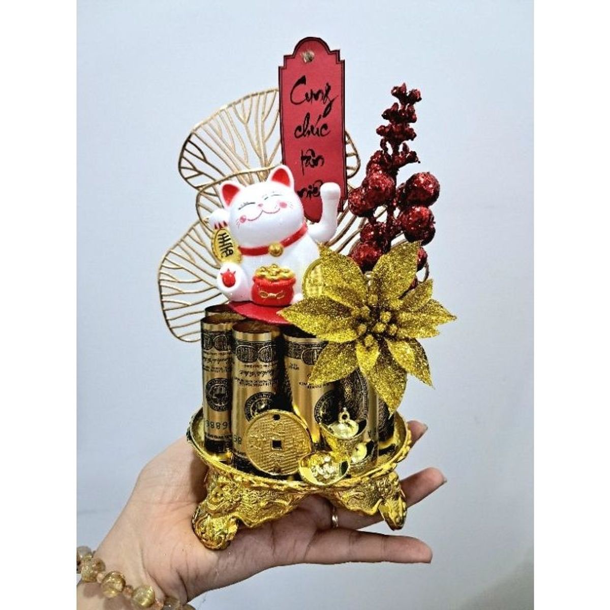 - Sản phẩm kích thước bằng lòng bàn tay người lớn, bao gồm 1 tầng đôla và 1 mèo thần tài.