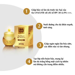 Sun Protect SPF 30 PA+++ giúp bảo vệ làn da khỏi các tác hại của tia UVA/UVB, giúp ngăn ngừa lão hóa sớm và đốm nâu với chỉ số SPF 30 PA +++.