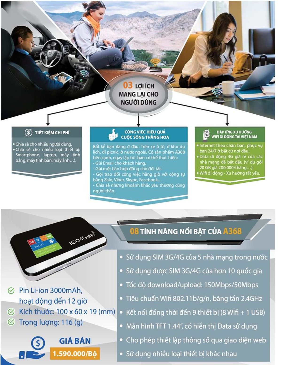 Thiết bị phát Wifi IGO A368 dùng được sim 3G/4G của tất cả các nhà mạng Việt Nam và hầu hết các quốc gia trên thế giới, 9 thiết bị có thể kết nối cùng lúc 8 kết nối Wifi và 1 kết nối bằng cổng USB.