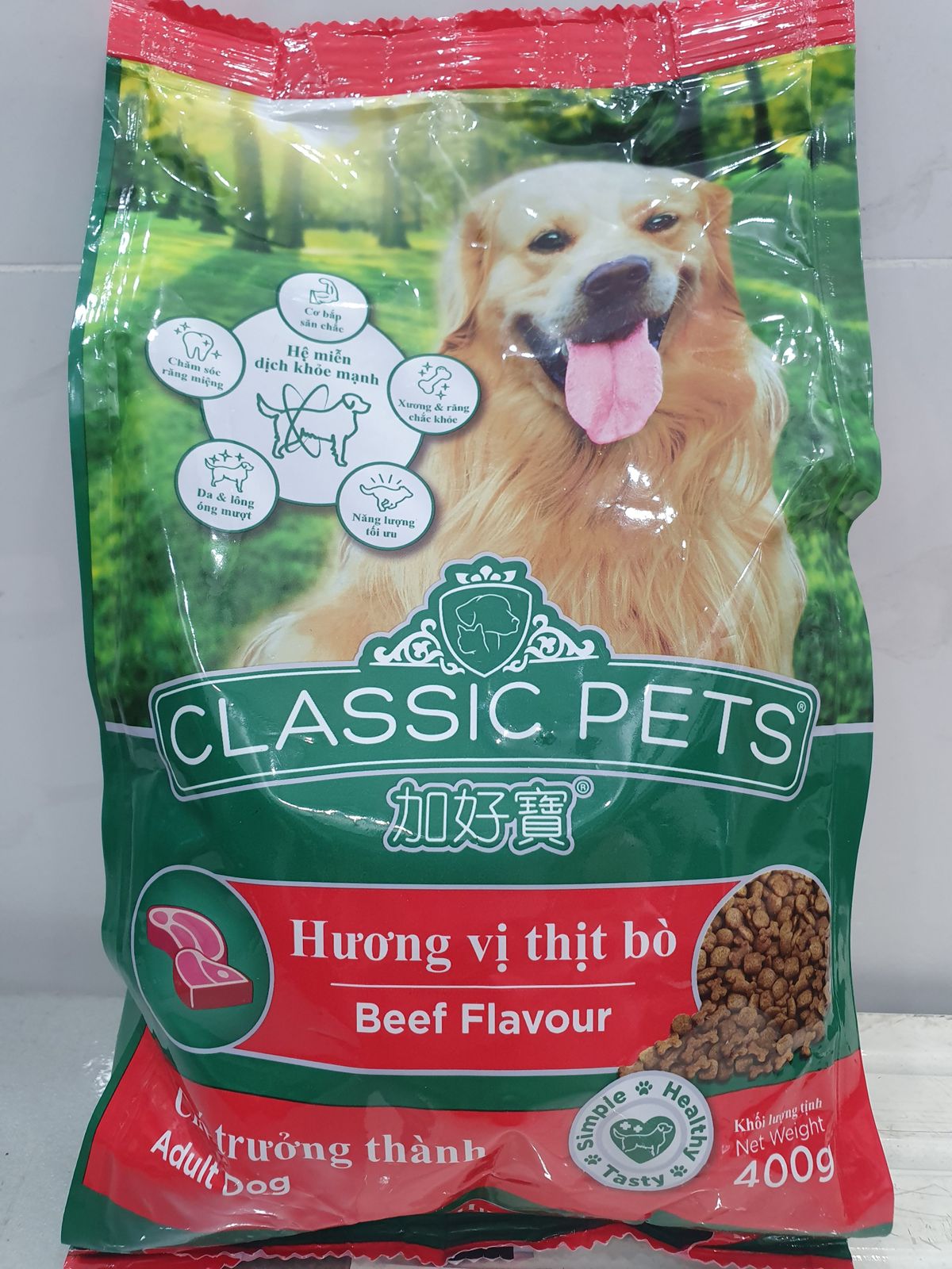 Thông tin sản phẩm: Tinh Bột: là nguồn năng lượng chính trong cơ thể của thú nuôi, ngoài ra tinh bột trong thức ăn viên khô giúp ngăn chặn bệnh táo bón ruột.Chất Béo kích thích sự ăn uống ngon miệng, cung cấp axit béo cần thiết giúp duy làn da và bộ lông khỏe mạnh mượt mà.Khoáng Chất hình thành xương và sụn (như Ca và P), tạo ra các phản ứng Enzyme giúp tiêu hóa tốt, duy trì và cân bằng chất lỏng, ổn định sự co thắtcủa cơ bắp và chức năng thần kinh.Vitamin giúp chống lão hóa, cân bằng Canxi trong máu, tạo khoáng chất cho xương và răng, ổn định thể trạng trong sinh sản, tăng cường hệ miễn dịch, tăng cường thị giác. Nườc là một môi trường lỏng cho máu và hệ thống bạch huyết giúp ổn định nhiệt độ cơ thể.Hệ thống tiêu hóa khỏe mạnh và hấp thu tốt chất dinh dưỡngCân bằng tối ưu giữa Omega 3 và Omega 6 giúp hỗ trợ sự phát triển cho da và lôngCanxi và Photpho giúp cho răng và xương cứng cáp, khỏe mạnh.Xuất Xứ: THÁI LANhức Ăn Cho Chó Lớn Classic Adult vị Thịt BòKhối lượng: 400gHạn sử dụng: 24 tháng kể từ ngày sản xuấtMô Tả Sản Phẩm:Thức Ăn Classic Pets Dành Cho Chó Lớn Gói 400gr - Tổng hợp các thành phần dinh dưỡng như tinh bột, khoáng chất, vitamin, nước... mang lại cho chó hệ tiêu hóa khỏe mạnh.
