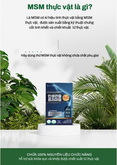 1. Thành Phần Chính:- MSM thực vật 2.000mg: Là hoạt chất cấu tạo nên mô sụn, xương, khớp với khả năng giúp giảm đau khớp, cải thiện chức năng vật lý xương khớp, giảm cứng khớp, cải thiện tổng điểm WOMAC (thang điểm về sức khỏe xương khớp).