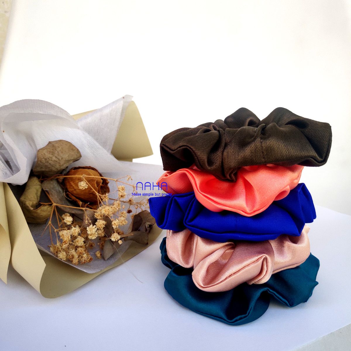 *Vải do Naha tự lựa chọn và lên ý tưởng mẫu và phối màu giữa các sản phẩm scrunchies, thun buộc tóc Naha.