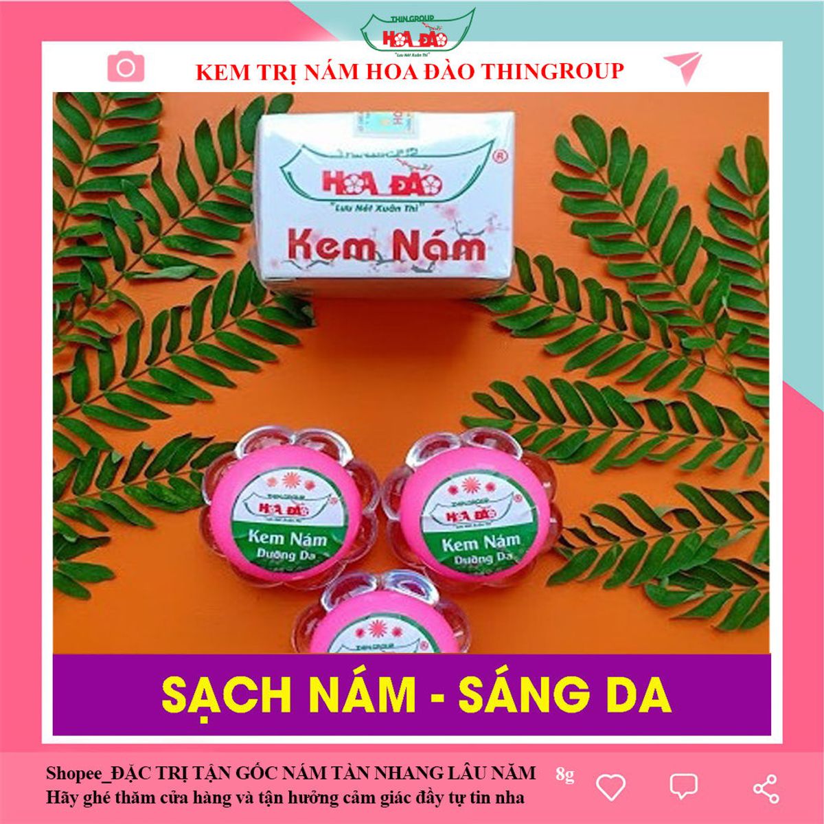 Kem Trị Nám Hoa Đào THÀNH PHẦN: Kem Trị Nám Hoa Đào của công ty ThinGroup được chiết xuất 100% từ thảo dược đông y như: Hoa đào, nhân sâm, bí đao, cát căn,... CÔNG DỤNG: kem trị nám, tàn nhang Hoa đào là sản phẩm được bào chế riêng biệt đặc tất cả các loại nám, tàn nhang. Ngoài ra, Kem trị nám Hoa đào còn có tác dụng vô cùng tuyệt vời trong dưỡng trắng da, phục hồi da hư tổn, da sạm màu Sau khi hết nám, tàn nhang bạn có thể sử dụng kem trị nám, tàn nhang hoa đào dưỡng da mỗi đêm, giúp làm đều sắc tô da để có làn da trắng hồng, mịn màng. CÁCH DÙNG: Với sản phẩm kem trị nám Hoa Đào việc sử dụng vô cùng dễ dàng với các bước sau: Mỗi tối trước khi đi ngủ bạn rửa sạch vùng cần bôi kem. Sau đó bạn thoa một lớp kem và nhẹ nhàng mát xa đều khắp vùng bị nám, tàn nhang cho kem nhanh thẩm thấu và đạt hiệu quả cao Vùng bị nám nặng có thể bôi nhiều kem hơn. Để qua đêm, sáng dậy rửa mặt sạch. Bạn nên dùng kem đều đặn mỗi ngày để đạt hiệu quả tốt nhất. Bảo Quản: Bảo quản nơi khô ráo thoáng mát, Tránh ánh sáng trực tiếp từ mặt trời Chú ý: Kem trị nám Hoa đào là sản phẩm độc quyền của công ty TNHH ThinGroup, không có doanh nghiệp, cá nhân nào được sử dụng Hoa Đào. Vì vậy để đảm bảo mua được quý khách vui lòng mua tại các đại lý được xác nhận bởi công tycó banner cấp chứng nhận, hoặc kiểm tra mã vạch, tem chống hàng giả của Bộ Công An khi rọi đèn hiện chữ BCA.