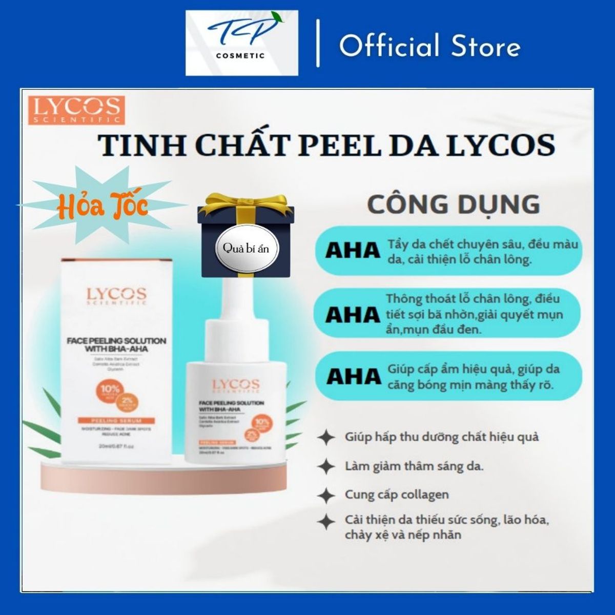- Lycos Face Peeling solution 10%AHA và 2%BHA là dạng tẩy tế bào chết chuyên sâu, (Glycolic, Salicylic acid, Hyaluronic acid) kết hợp vỏ cây liễu giúp tác động sâu thông thoáng lỗ chân lông giải quyết tình trạng tắc nghẽn, hỗ trợ giải quyết mụn ẩn, mụn đầu đen và thâm mụn hiệu quả, loại bỏ lớp sừng trên bề mặt da, tái tạo lại tế bào da mới, dưỡng da căng mịn và đều màu…