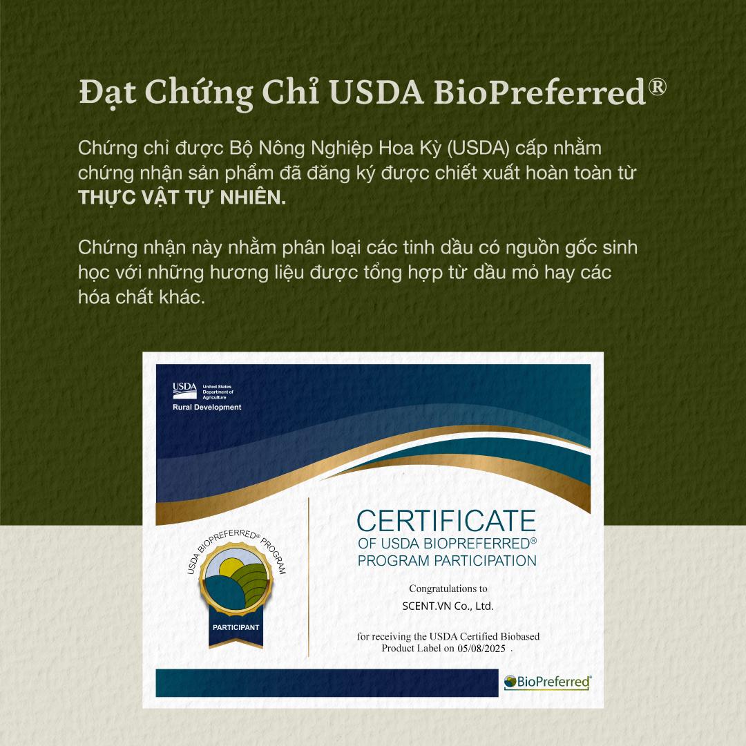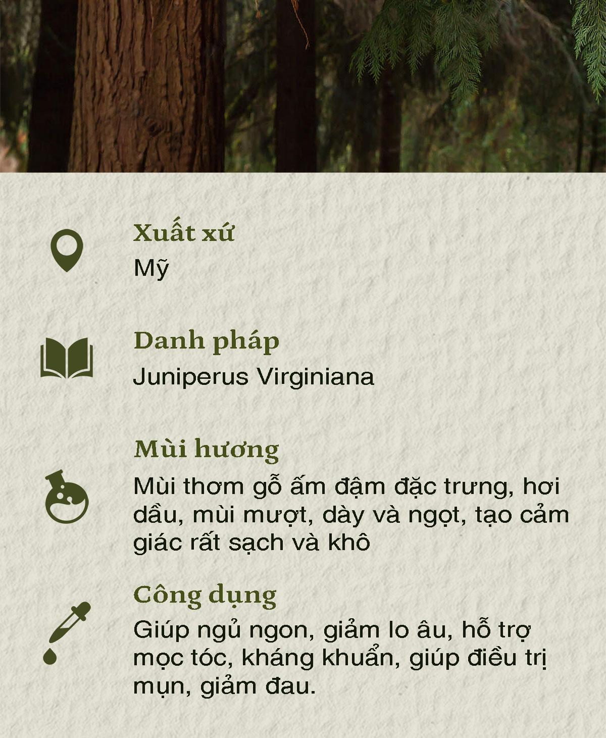 Tinh dầu có hương khô, ấm, gỗ đậm pha chút dầu nhẹ, mượt và dày, mang vị ngọt rõ rệt. Khi drydown, mùi trở nên khô hơn và ngọt dịu, tạo cảm giác ấm áp, sạch sẽ và dễ chịu hơn so với các dòng Cedarwood khác. SCENT nhập khẩu trực tiếp từ Mỹ – vùng bản địa của cây – để đảm bảo mùi hương nguyên bản, đậm đà và chất lượng cao.