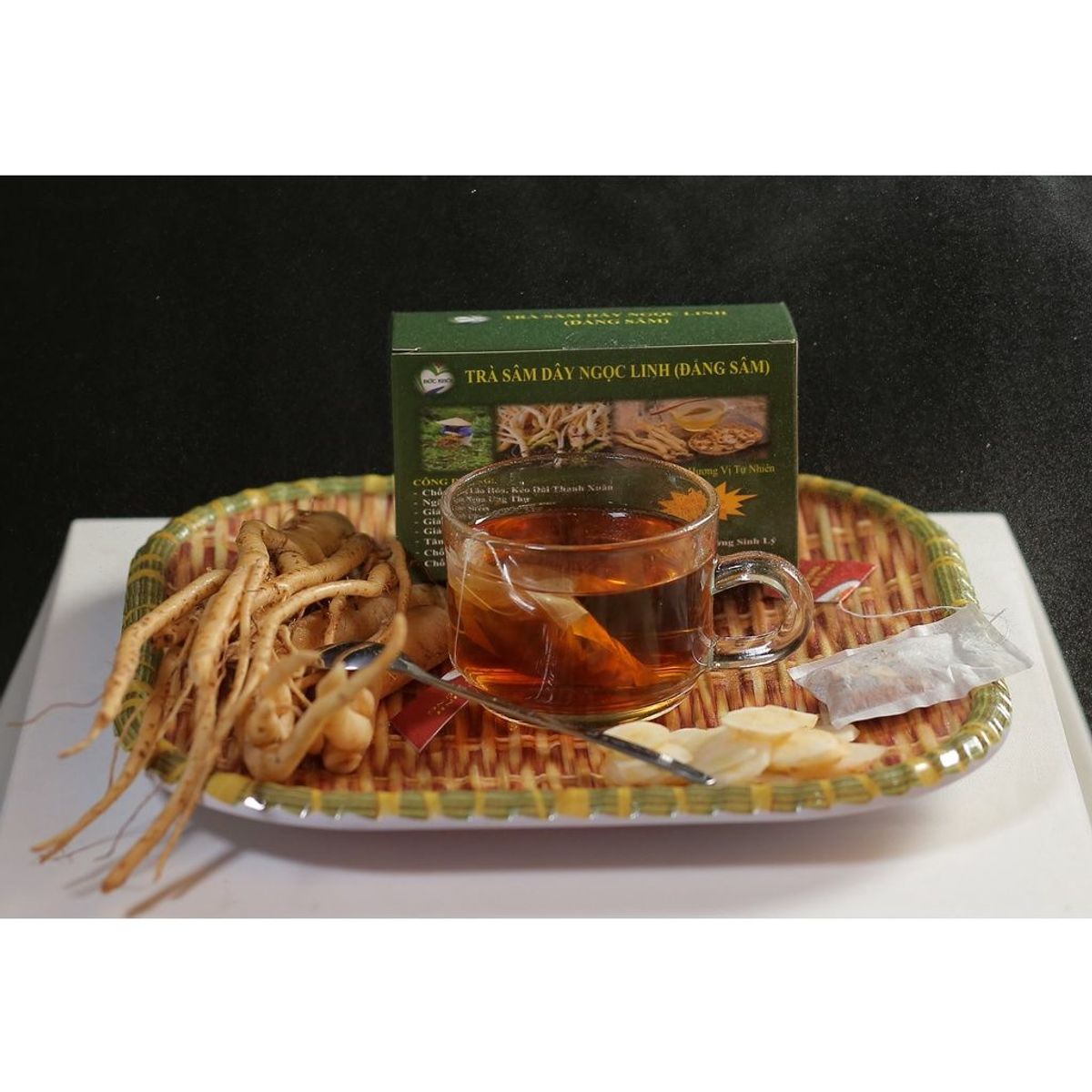 • Sản phẩm được chế biến hoàn toàn từ sâm dây Ngọc Linh được khai thác tại vùng núi Ngọc Linh – Kon Tum.