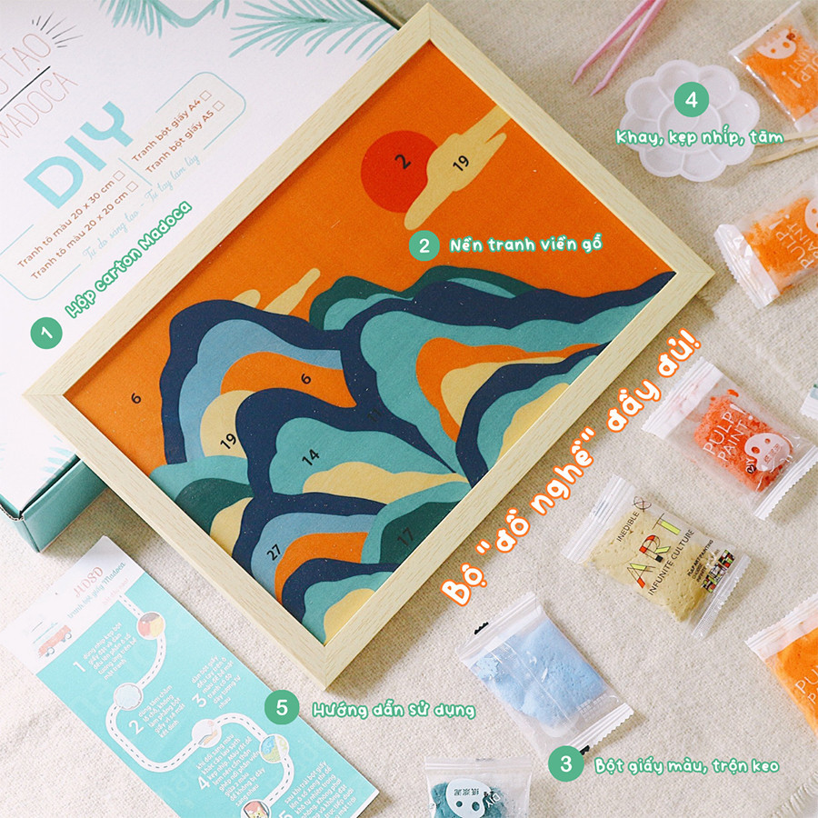 Tranh bột giấy là một trong những sản phẩm DIY (tự tay làm lấy) hoàn toàn mới và đang hot hiện nay. Với bộ sản phẩm làm tranh bột giấy của Madoca, bạn hoàn toàn có thể tự tay tạo nên những tác phẩm nghệ thuật độc đáo và đầy màu sắc để trang trí nhà cửa, tặng cho bạn bè, người thân.