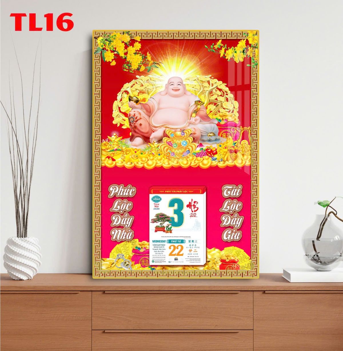 Sản phẩm được thiết kế với hình ảnh sắc nét, màu sắc chủ đạo đỏ và vàng - hai màu sắc tượng trưng cho sự giàu sang, tài lộc và may mắn. Kích thước linh hoạt của lịch sẽ giúp bạn dễ dàng trang trí bất kỳ không gian nào, từ phòng khách, văn phòng cho đến cửa hàng.