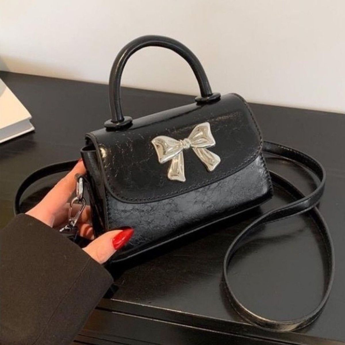 Túi xách nữ kẹp nách đeo chéo 1 quai da nhăn bóng đính nơ bạc K442