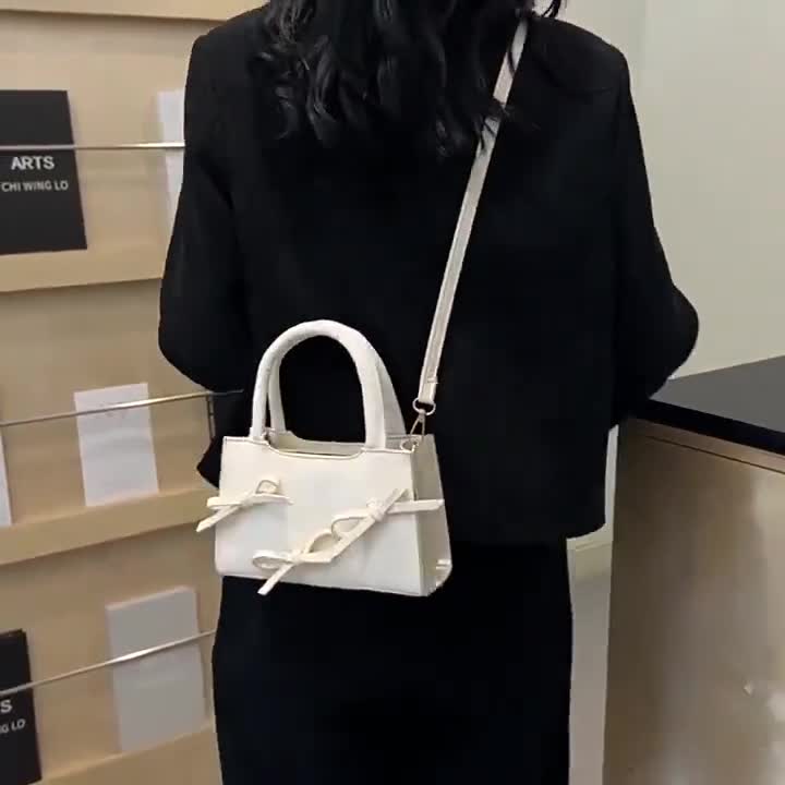 Chiếc túi mang thiết kế hai quai tiện lợi, đính kèm nơ nhỏ xinh yêu cực kỳ, vừa có thể đeo chéo, vừa cầm tay đi chơi, đi làm hay cà phê cuối tuần đều cực hợp