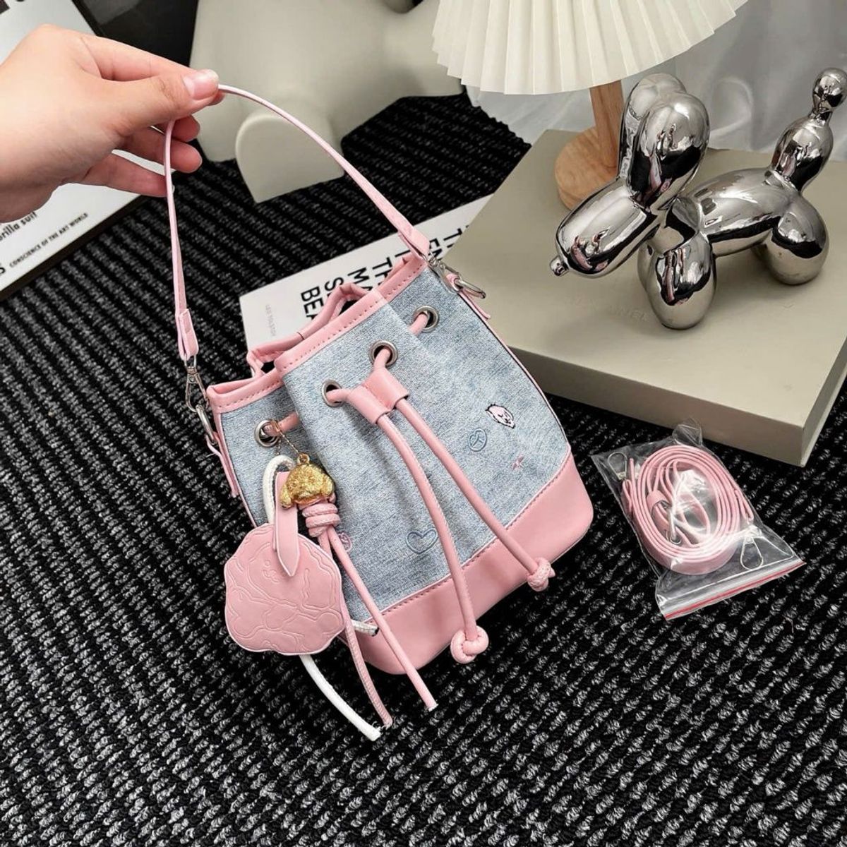 Túi xách nữ, túi đeo chéo dáng chậu dây rút da in 2 dây tặng kèm móc treo cún dễ thương K739