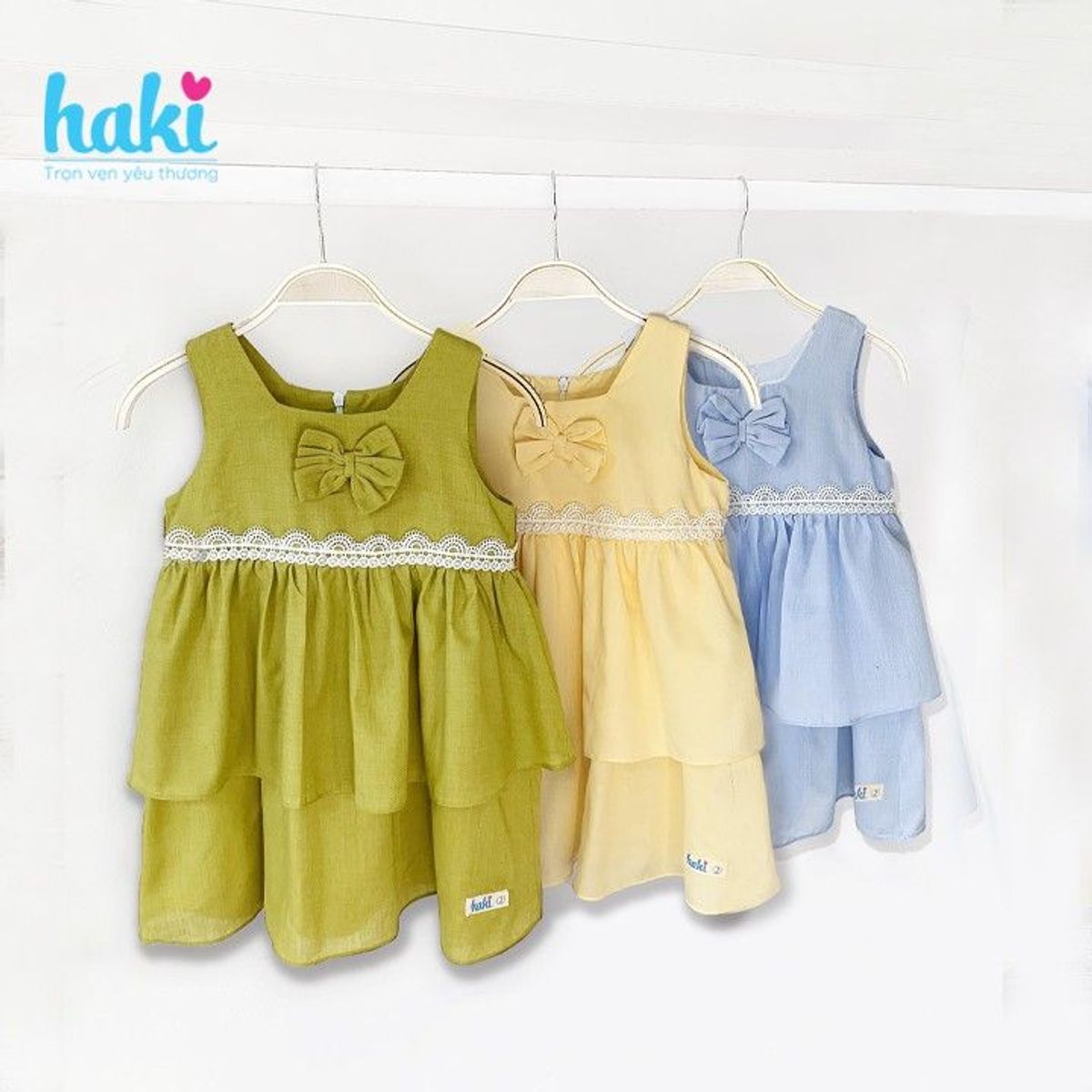 Váy sát nách hai tầng phối ren, đính nơ của Haki mang một sắc nhẹ nhàng, dễ mặc, rất thích hợp cho ba mẹ thêm mới phong cách cho tủ đồ của bé yêu.