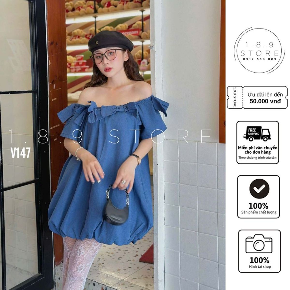 Váy bò mềm trễ vai phối nơ form bồng baby doll thiết kế dành cho các nàng thơ đi cafe