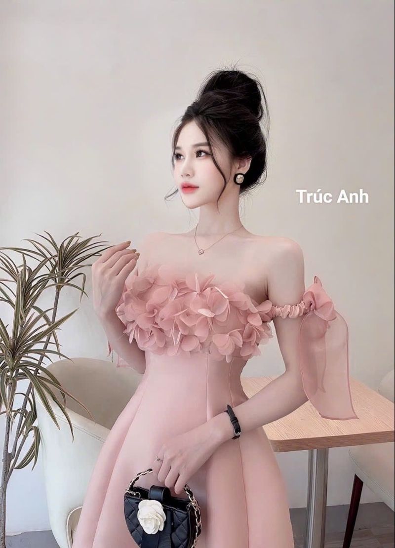 Váy Hồng thiết kế đính hoa tơ