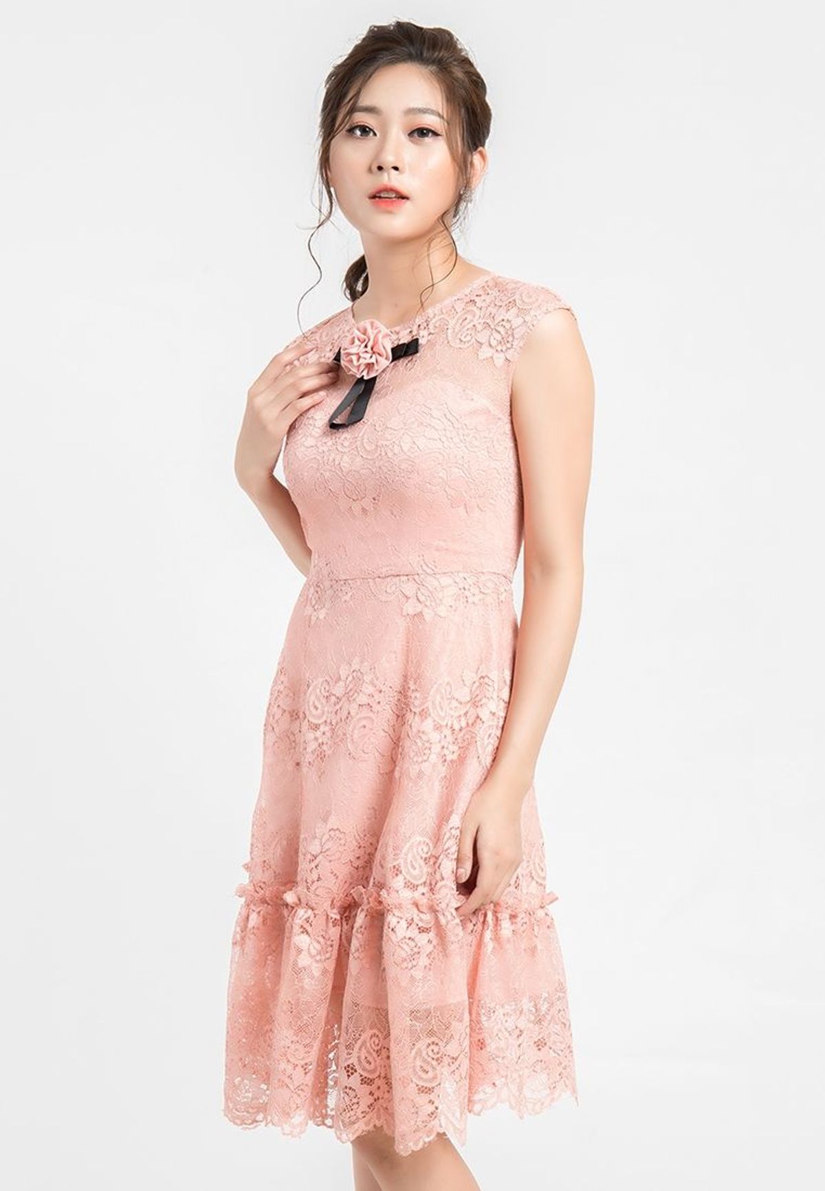 - Đầm dáng ôm eo,phủ ren lớp ngoài,thân dưới nhún chân