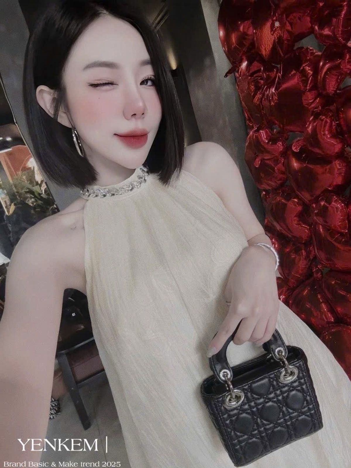 Form yếm ôm nhẹ tôn dáng, giúp tôn lên bờ vai và xương quai xanh đầy cuốn hút. Phần cổ đính đá lấp lánh là điểm nhấn tinh tế, bắt sáng nhẹ nhàng, giúp nàng nổi bật mà vẫn giữ được nét thanh lịch.
