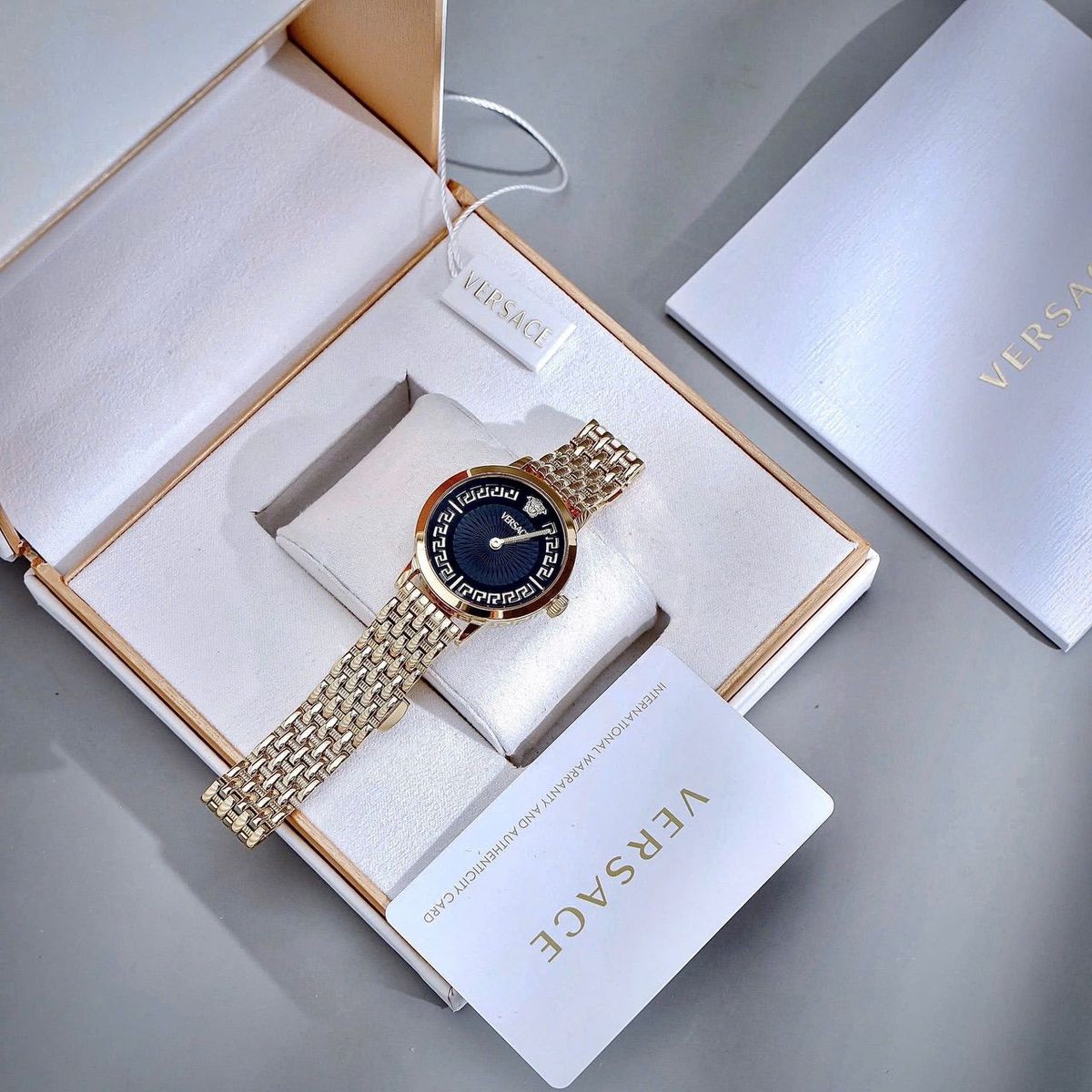• Đồng hồ Versace mặt đen huyền bí, viền họa tiết Hy Lạp sang trọng, biểu tượng Medusa vàng nổi bật, dây thép mạ vàng cao cấp – tạo nên vẻ đẹp thanh lịch, thời thượng và đầy đẳng cấp cho phái nữ.