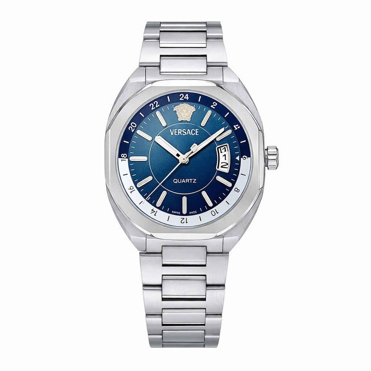 • Đồng hồ Versace sở hữu mặt xanh navy sang trọng, biểu tượng Medusa đặc trưng cùng lịch ngày tiện dụng. Dây thép không gỉ chắc chắn, thiết kế mạnh mẽ nhưng tinh tế, phù hợp quý ông yêu phong cách hiện đại, đẳng cấp và dễ phối trang phục hằng ngày.