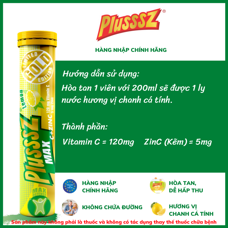 - Khi bạn mệt mỏi, khi bạn cảm thấy căng thẳng trong công việc, Viên sủi bọt Plusssz Max vitamin C & Kẽm cung cấp các Vitamin C và khoáng chất thiết yếu cho nhu cầu hàng ngày của cơ thể. Mỗi viên chứa 120mg Vitamin C, giúp cho hệ miễn dịch hoạt động tốt, từ đó giúp tăng cường sức đề kháng chống lại các tác nhân gây bệnh. Sử dụng Plusssz Max Vitamin C & ZinC mỗi ngày giúp cơ thể bổ sung vitamin C và Kẽm hỗ trợ tăng cường sức đề kháng, tăng cường sức khỏe để tăng năng suất lao động và học tập.