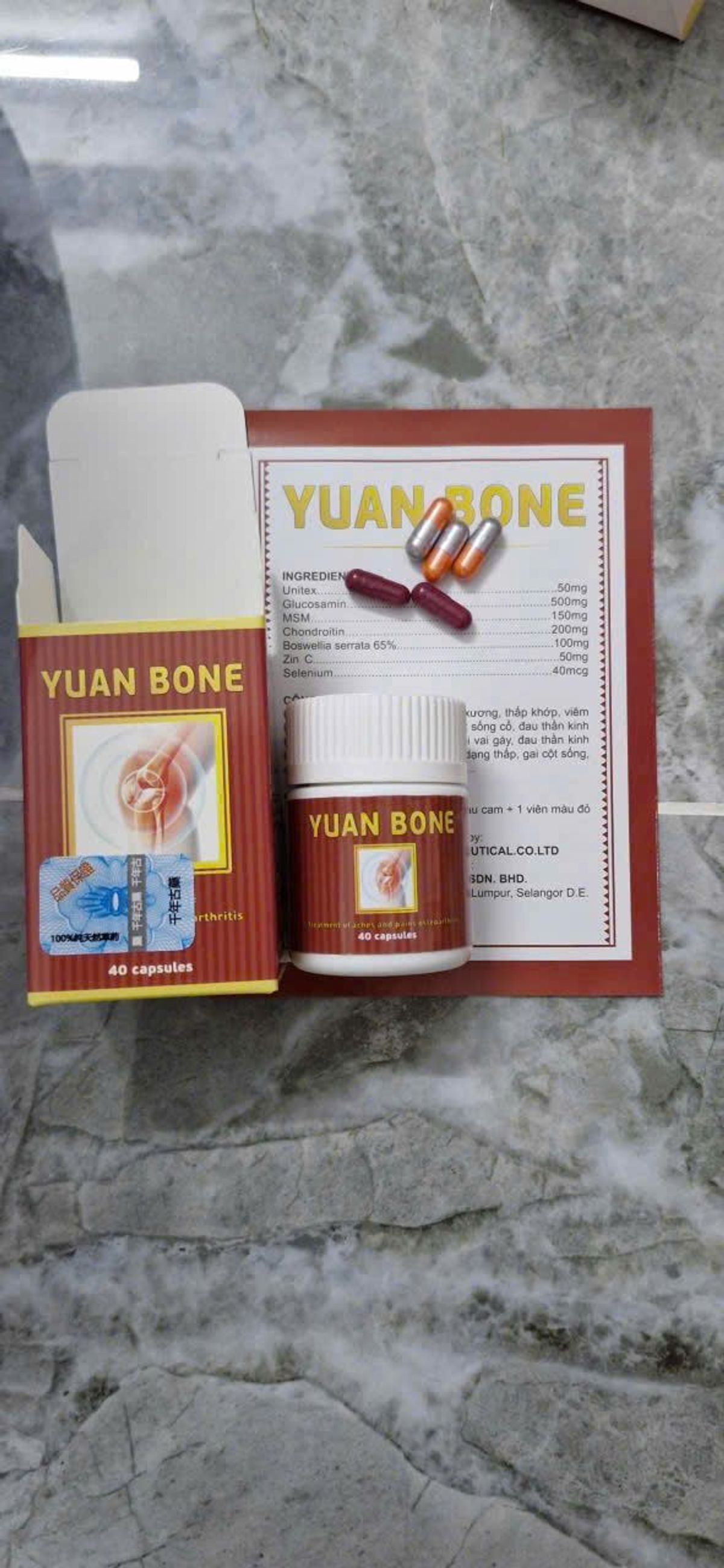 Thành phần của Yuan bone Unifex 50mg. Glucosamin 500mg. MSM 150mg. Chondroitin 200mg. Boswellia serrata 65% 100mg. Zin C 50mg. Selenium 40mcg. Dang bào chế Viên uống. Công dụng - Chỉ định của Yuan bone Ho tro các chứng đau nhức xương khớp, thấp khớp, viêm khớp, thoái hóa khớp, thoái hóa đốt sống cổ, đau thân kinh tọa, gout, thoát vị đĩa đệm, đau mỏi vai gáy, đau thần kinh liên sườn, tê dại tứ chi, viêm khớp dạng thấp, gai cột sông, dau dầu, đau lưng, đau mỏi gối... Cách dùng - Liêu dùng của Yuan bone Cách dùng: Sản phẩm dùng bảng dường uống. Liều dùng: Ngày uống 2 lần, mỗi