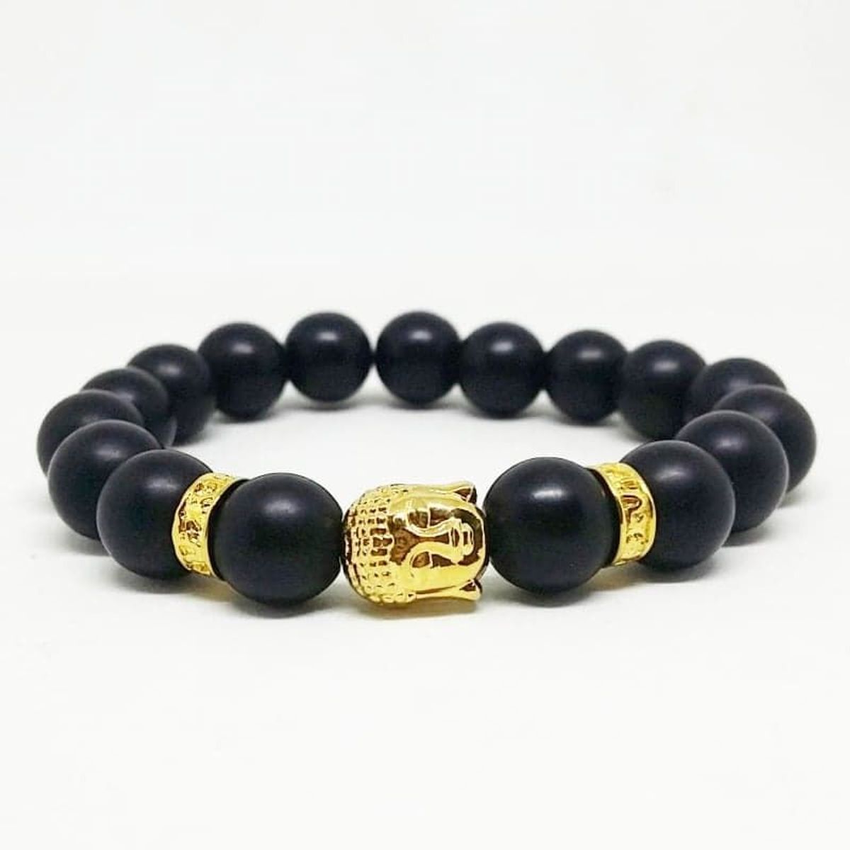 Vòng tay phong thủy đá đen mờ mix mặt phật màu vàng là vòng tay rất được ưa chuộng.