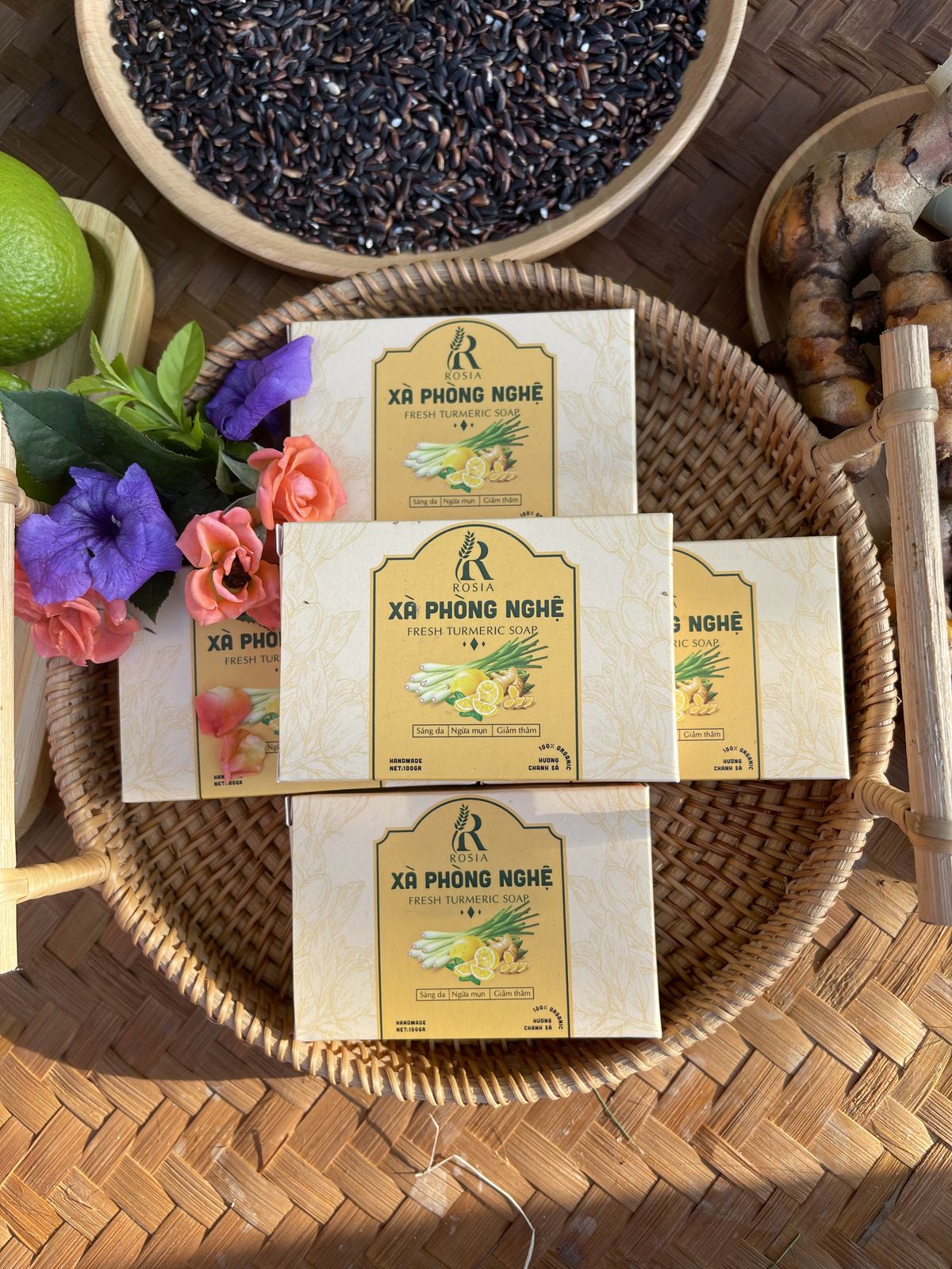 Thành phần: Soap base (phôi xà bông từ dầu Dừa chuẩn USDA và EU, dầu Cọ); Acid Citric (chanh); Chiết Xuất Nghệ; Phấn Hoa; Mật Ong.