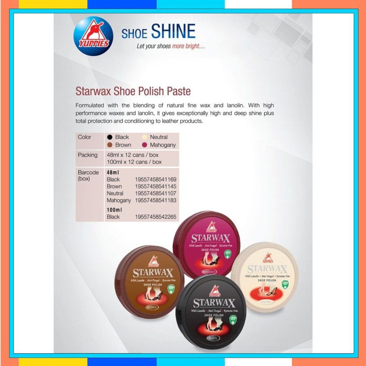 Xi đánh giày đen STARWAX khô là hỗn hợp các loại sáp tốt và mỡ cừu cho độ bóng sâu, lâu dài. Ngoài ra nó còn có mùi thơm tươi mát và có tác dụng làm mềm da, bảo vệ da.