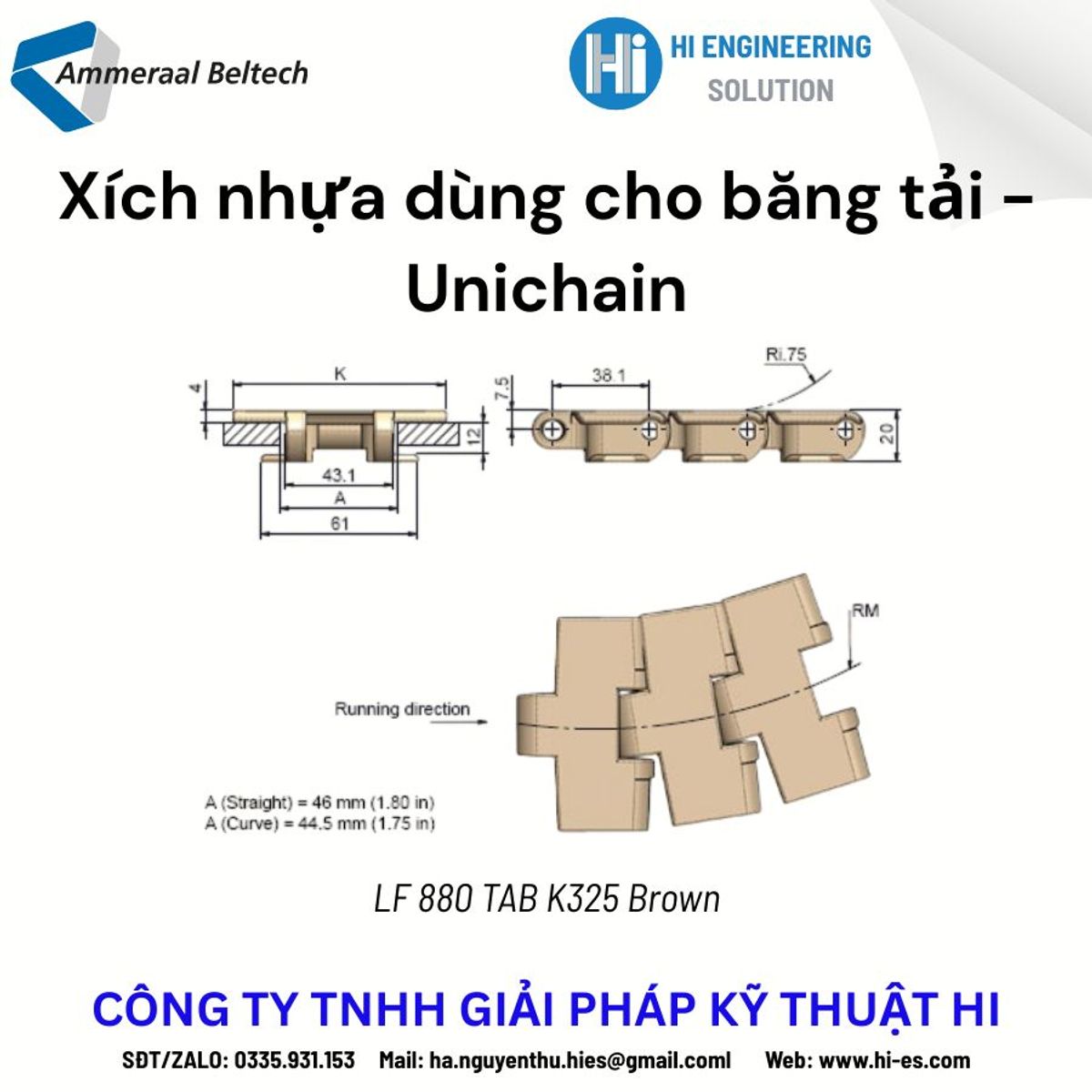 Xích nhựa Unichain 880 TAB K325 là dòng xích cong chuyên dụng cho băng tải trong các dây chuyền sản xuất công nghiệp, đặc biệt trong ngành đồ uống đóng chai/lon và thực phẩm đóng hộp.