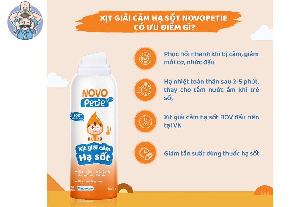 Novopetie xịt giải cảm hạ sốt ra đời với mong muốn giúp mẹ giải quyết nhẹ nhàng mỗi khi bé nóng sốt, cảm cúm, khi thuốc hạ sốt chưa kịp phát huy tác dụng, đồng thời giảm số lần, số lượng dùng thuốc hạ sốt cho bé. Xịt giải cảm hạ sốt Novopetie là sự kế thừa và phát huy những phương pháp dân gian truyền thống kết hợp công nghệ bào chế hiện đại.