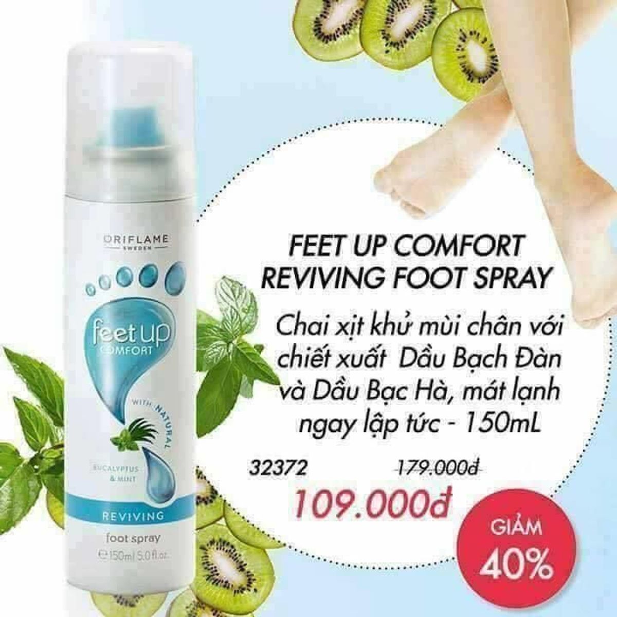 FEET UP COMFORT REVIVING FOOT SPRAY được chiết từ dầu bạch đàn, dầu bạc hà giúp bàn chân bạn mát lạnh tức thì và khử được mùi hôi chân khi đi giày. dung tích 150ml. sản tại Ba lan.