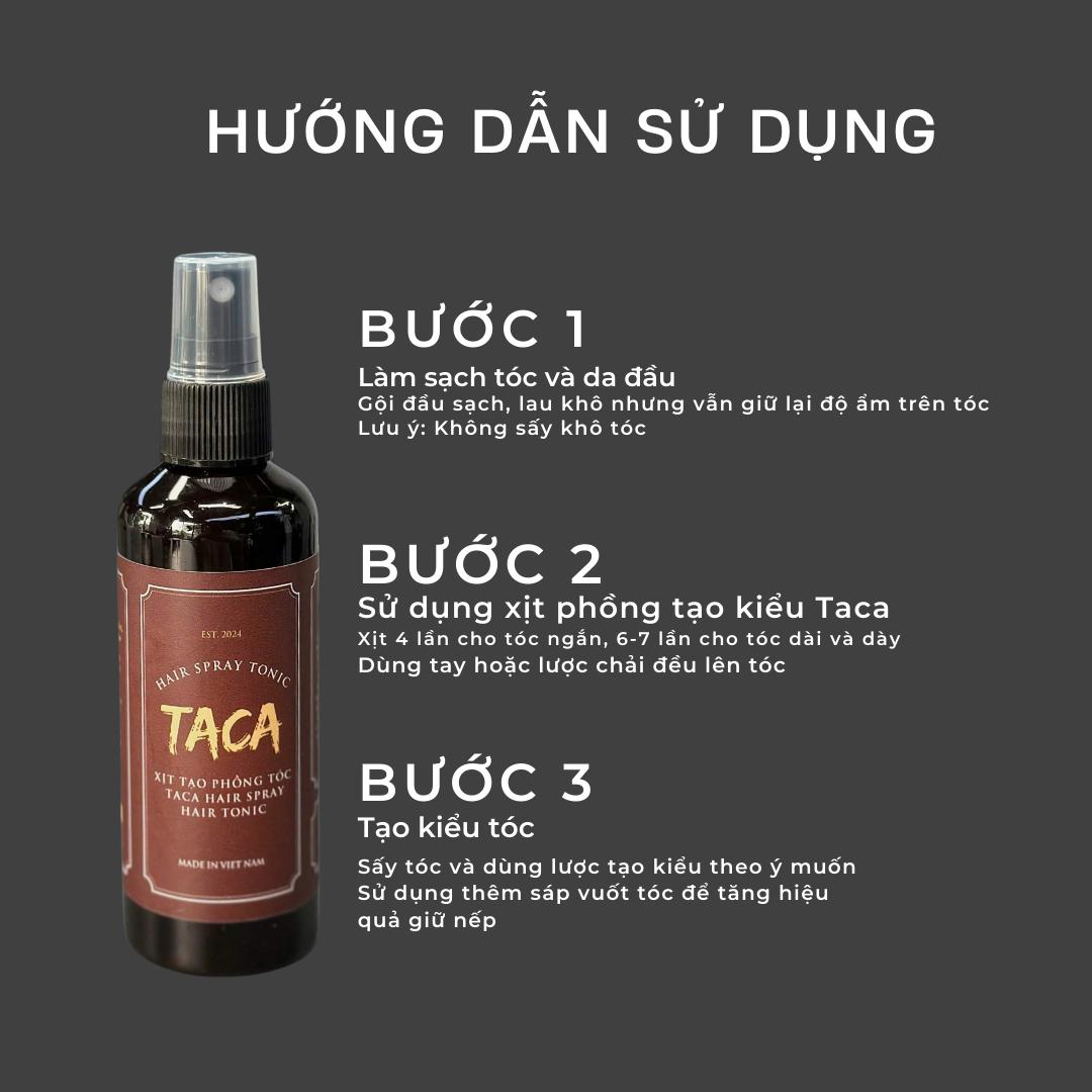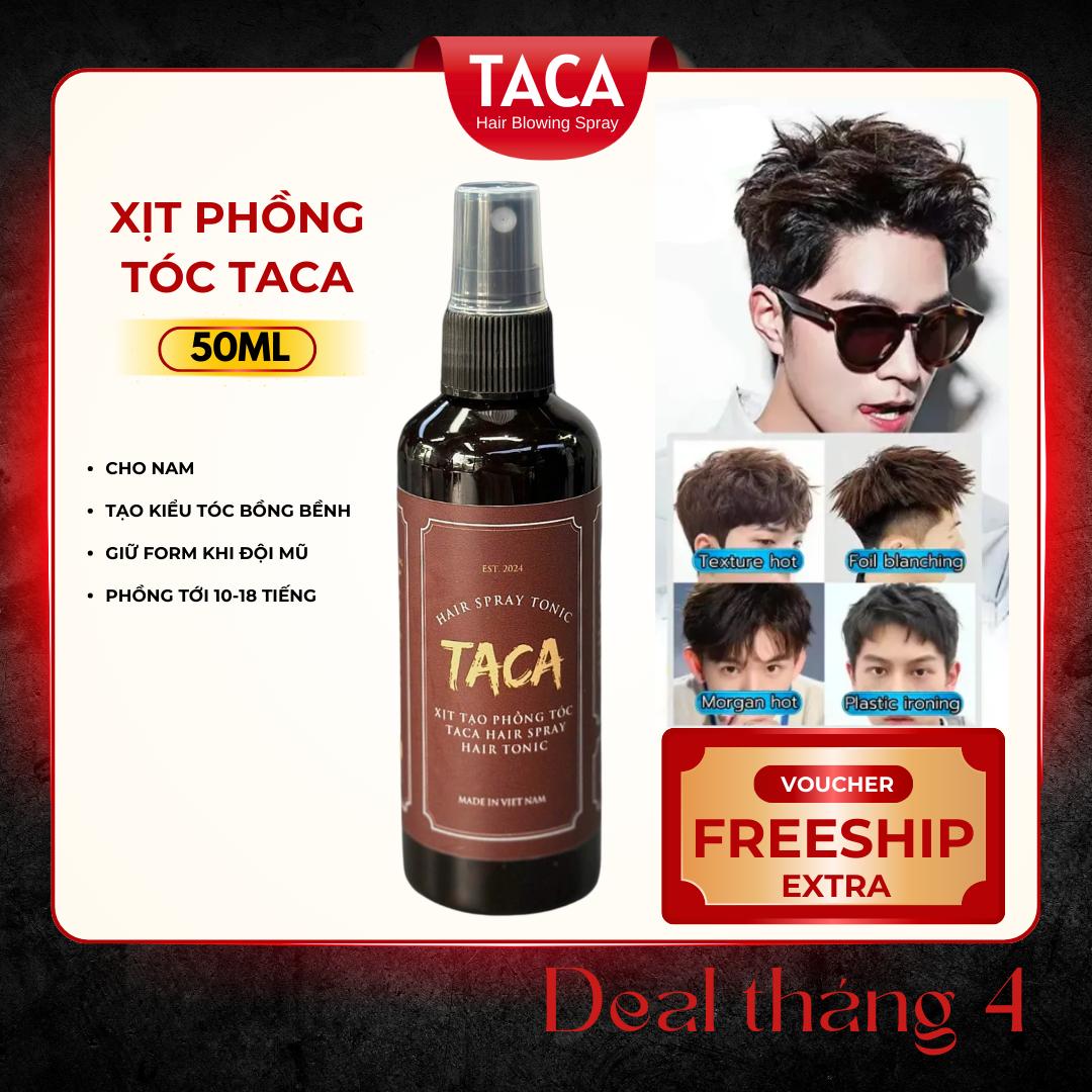 - Xịt tạo phồng tóc Hair Spray Tonic Taca là sản phẩm chai xịt giữ nếp pre-styling spray bảo vệ tóc khỏi nhiệt độ trước khi sấy, giúp bạn có một mái tóc sáng bóng tự nhiên, khỏe mạnh. Với công thức đặc biệt, sản phẩm giúp tóc giữ nếp lâu hơn, định hình kiểu tóc dễ dàng hơn và làm mái tóc phồng và trông dày hơn.
