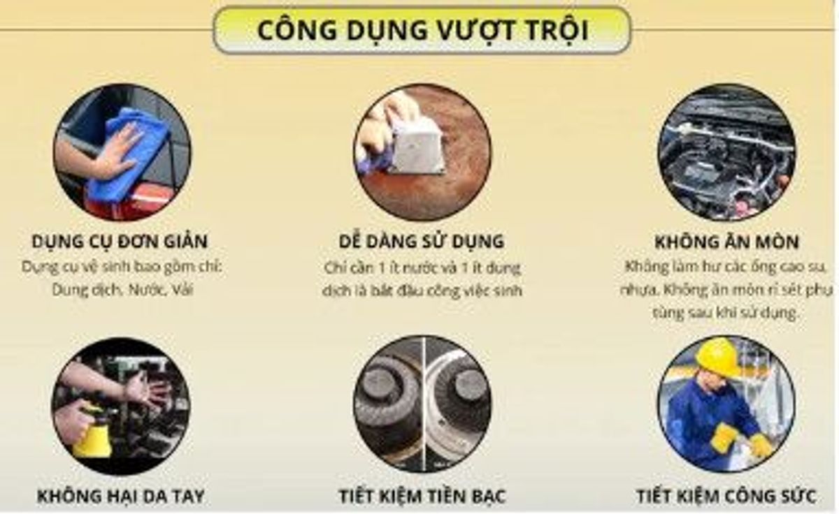 - Không ăn mòn: Không làm hỏng các ống cao su, nhựa... không ăn mòn, không làm rỉ sét phụ tùng sau khi sử dụng.