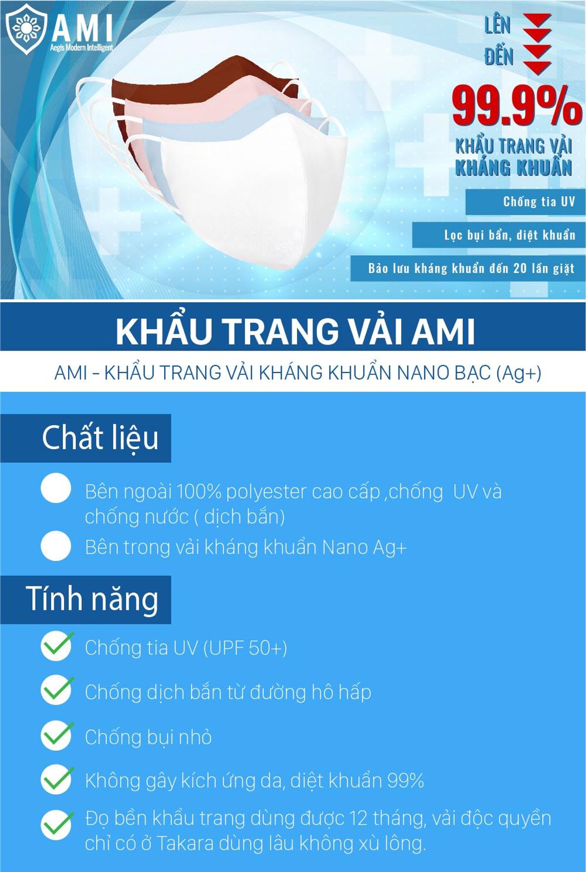 Khẩu trang vải AMI kháng khuẩn 99.9%, có giấy công bố do Viện Dệt May Việt Nam chứng nhận, các ưu thế của khẩu trang AMI: