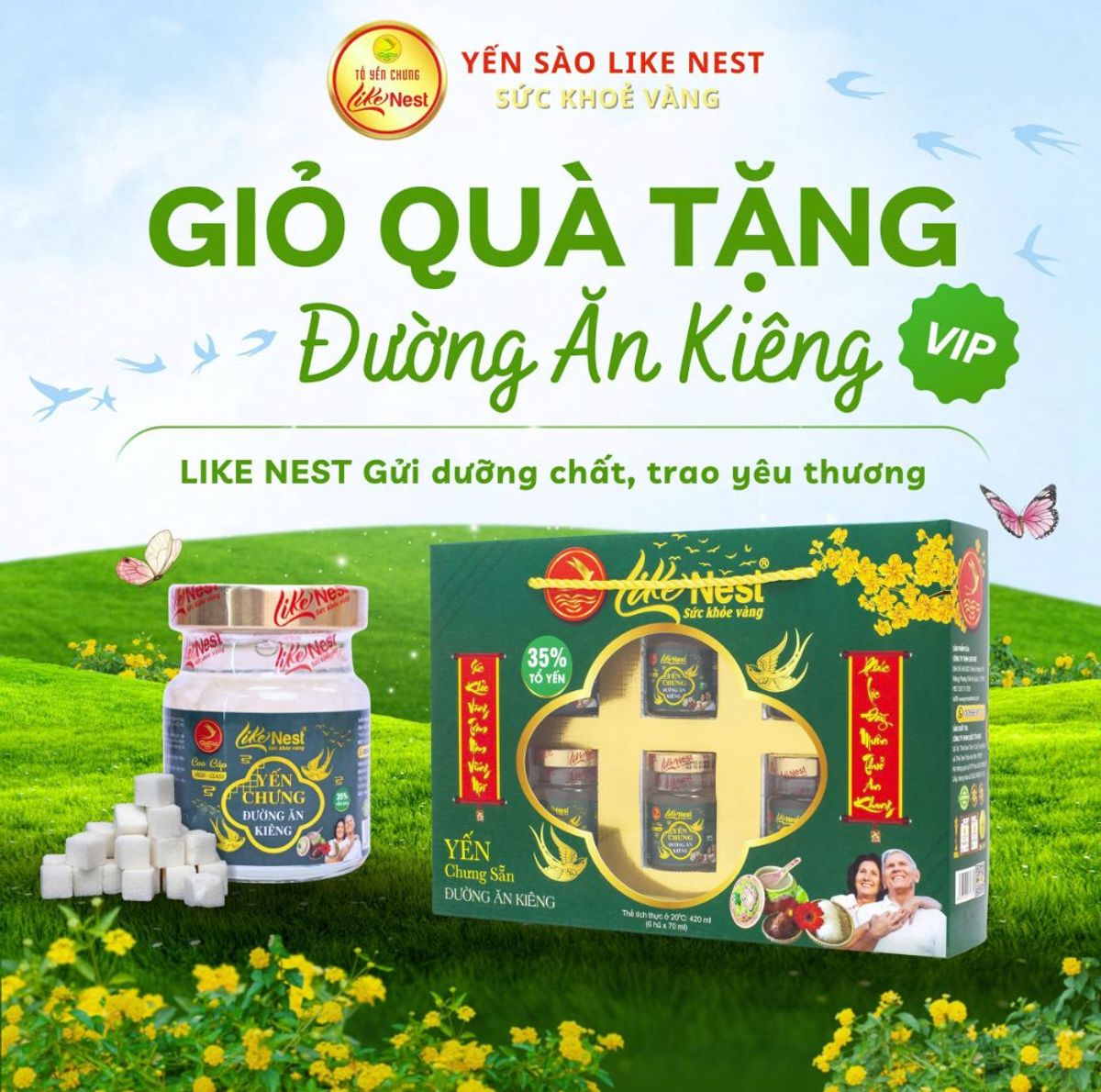 Yến chưng sẵn Like Nest vị đường ăn kiêng 35% (hộp quà VIP) là lựa chọn lý tưởng dành cho người ăn kiêng, người lớn tuổi, người tiểu đường nhẹ hoặc người muốn hạn chế đường nhưng vẫn muốn bổ sung dinh dưỡng từ yến. Với hàm lượng yến cao 35%, kết hợp cùng đường ăn kiêng an toàn, mang lại vị ngọt nhẹ, dễ uống và phù hợp cho nhiều đối tượng.
